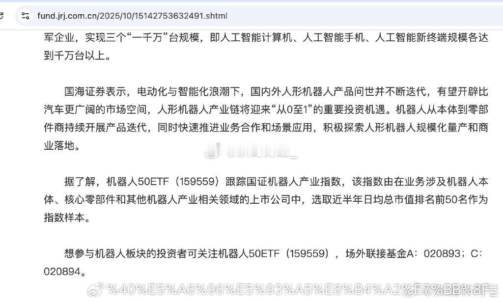 可以关注机器人50指数,这个指数是人性机器人本体、核心零部件和其他机器人产业相关领域的上市公司中,选取近半年日均总市值排名前50名作为指数样本。