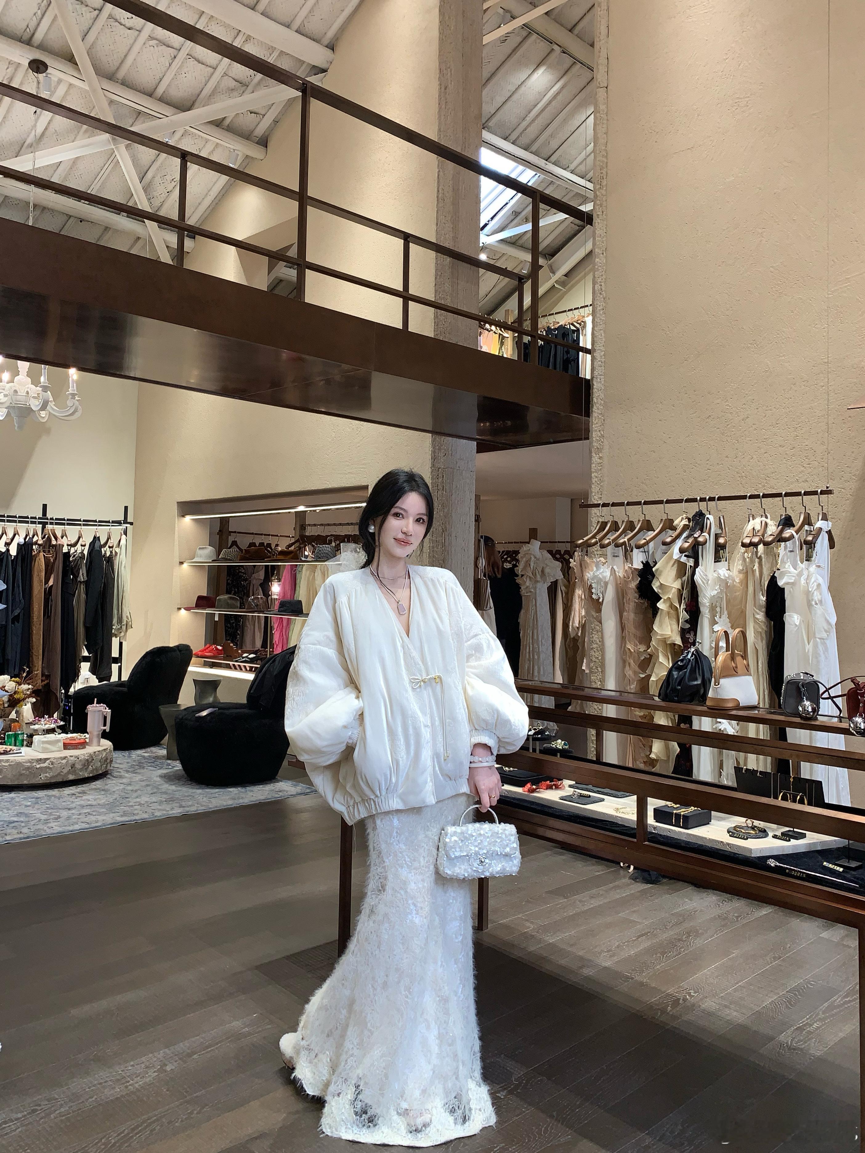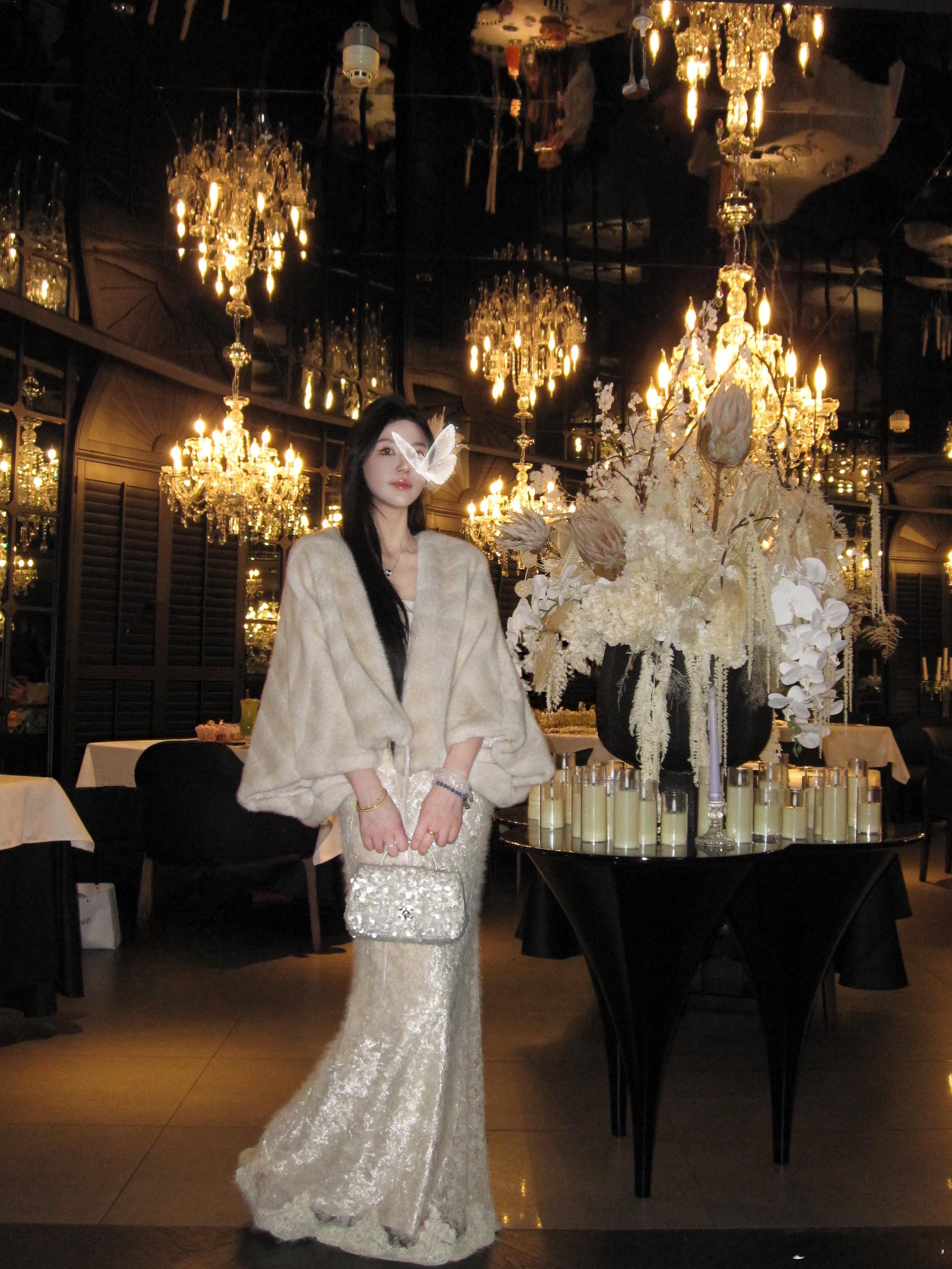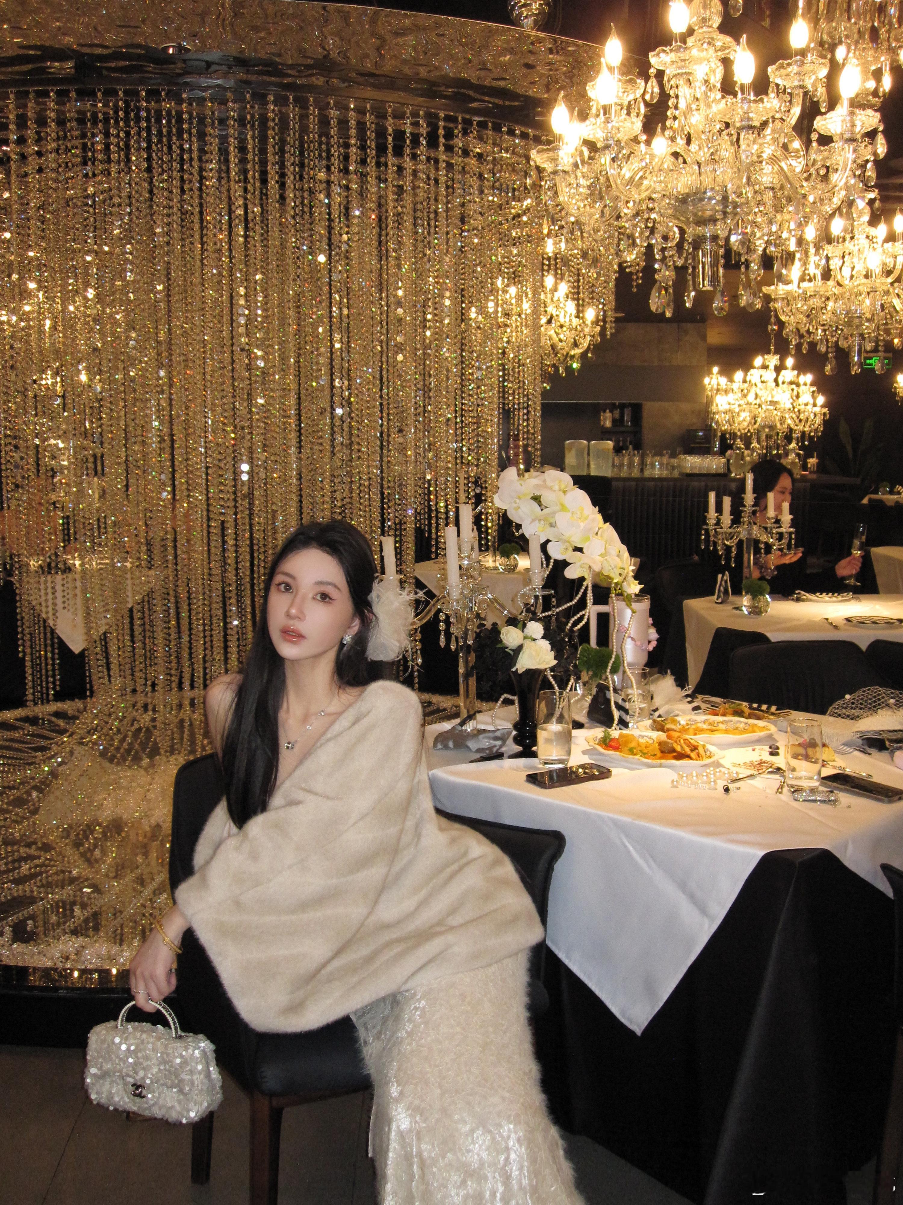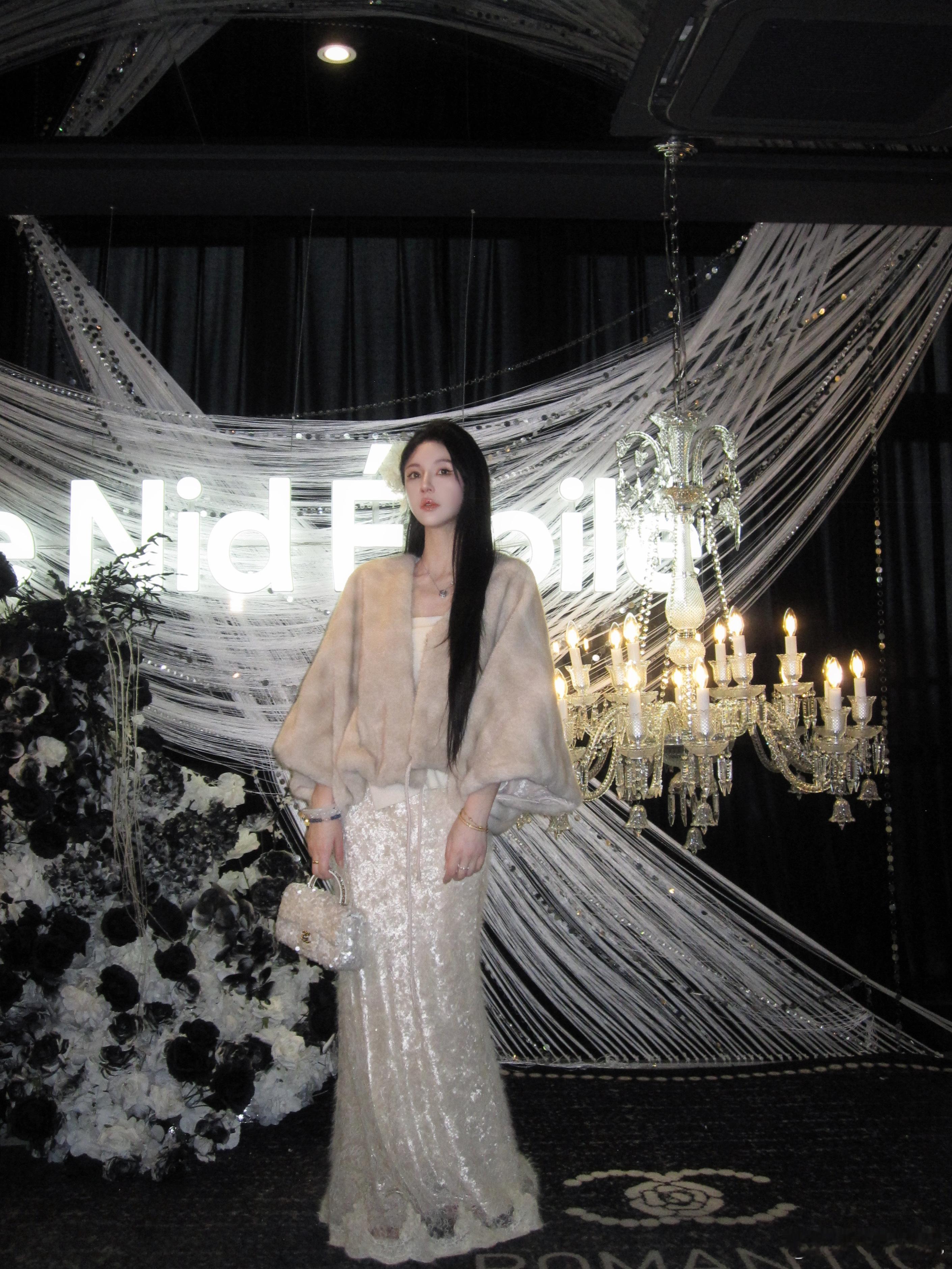 羽毛纱的篷松柔糯、珠片的璀璨闪烁✨丝绒的细腻垂坠相互交织,裙摆股线蕾丝花边如精致流苏,为半裙增添了浪漫柔美感,让造型瞬间蜕边为穿搭的“吸睛点”💡