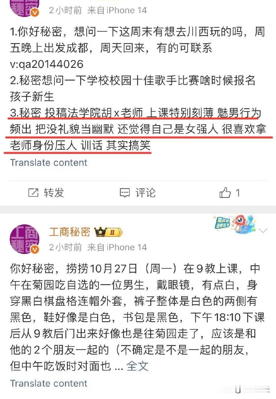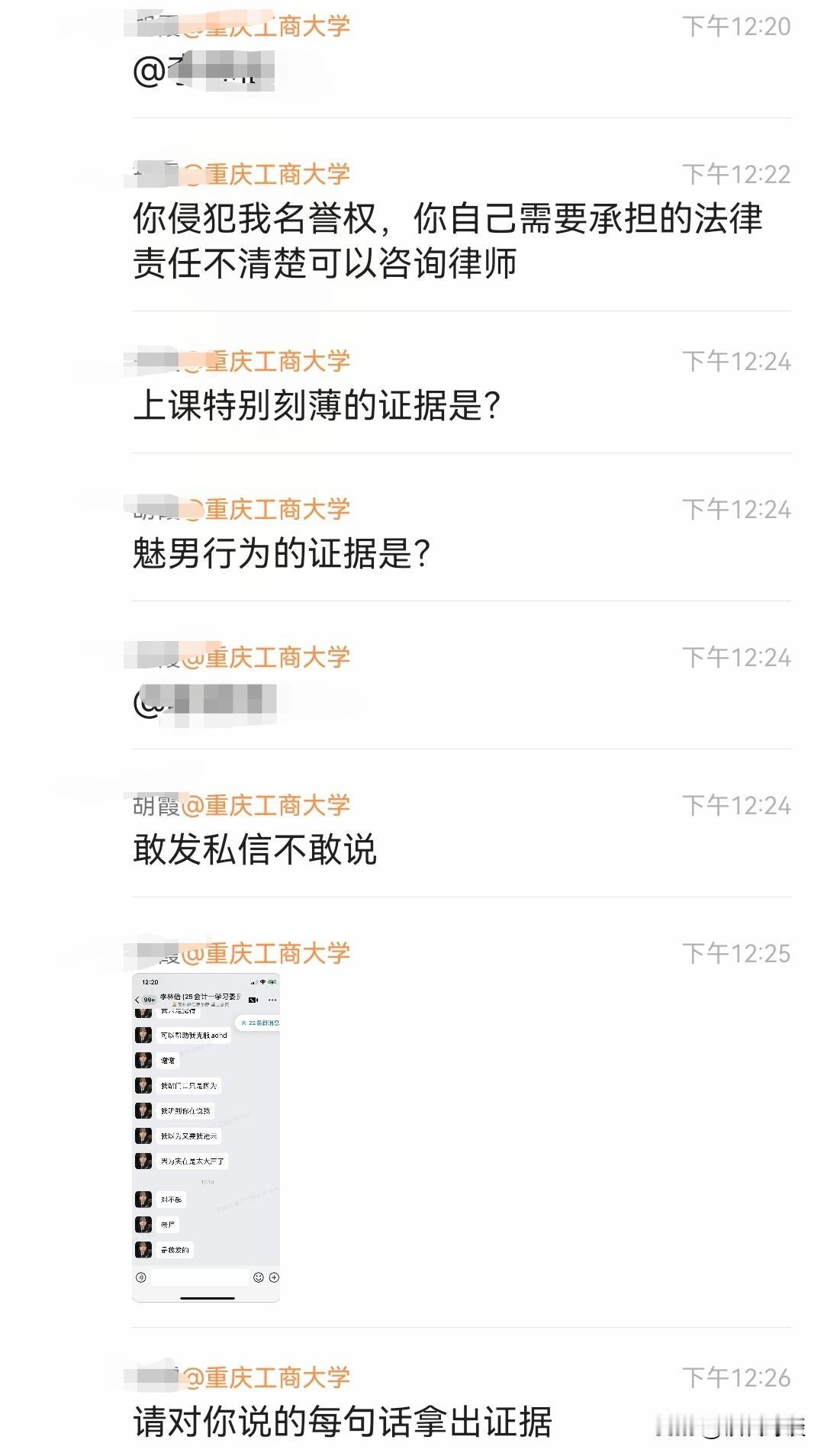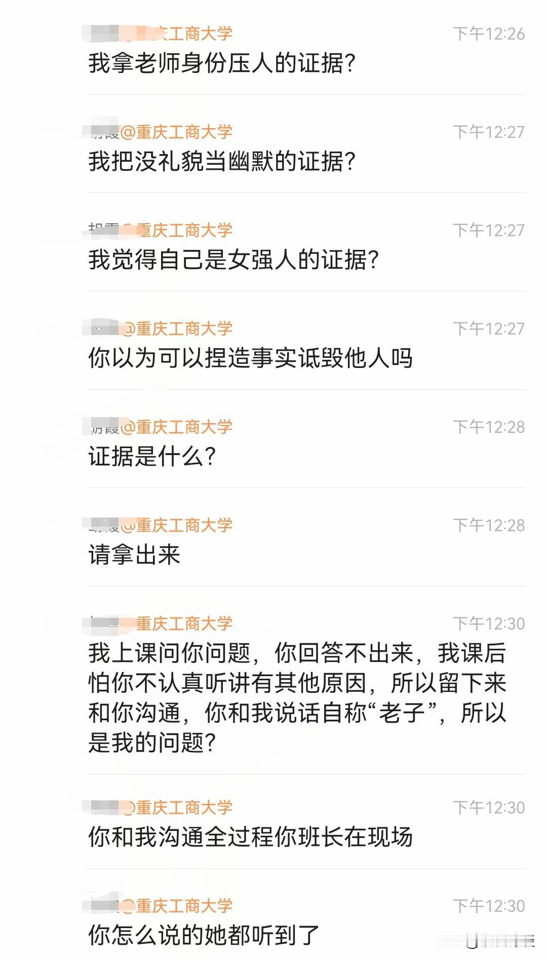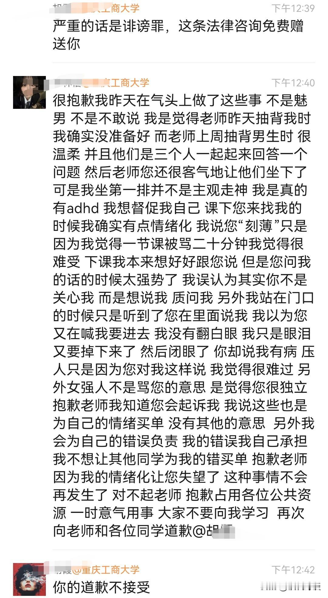 重庆工商大学的胡老师真是给学生上了一堂生动的法学课,这下那些目无尊长的学生应该要收敛一下了吧。 总结了一下,经过大致如下,10月29日,重庆工商大学一个女大学生因回答不上问题被老师批评,女大学生转身在网上吐槽女老师媚男,以老师身份压人。 不想被老师当众点名,并称保留证据称准备起诉其名誉侵权! 先不说老师有没有必要真的要这样做,但是经此一事,这个女学生当众道了歉,而且在某平台上也再次跟帖澄清道歉。想必那些有点目无尊长的学生该收敛一下了。 毕竟上课回答问题是作为学生的本职,回答不上了说明自己能力有待加强,难道非得搞得上大学只是为了走个过场点个名吗?