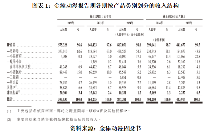 不过,令人担忧的是,金添动漫的业务高度依赖授权IP,2022—2024年及2025年上半年(下称“报告期”),其来自IP产品的收入占比均在95%以上。值得注意的是,金添动漫与IP方的合作通常是非独家的,且一般1~3年需要进行定期续约,其核心护城河的稳固性值得关注。