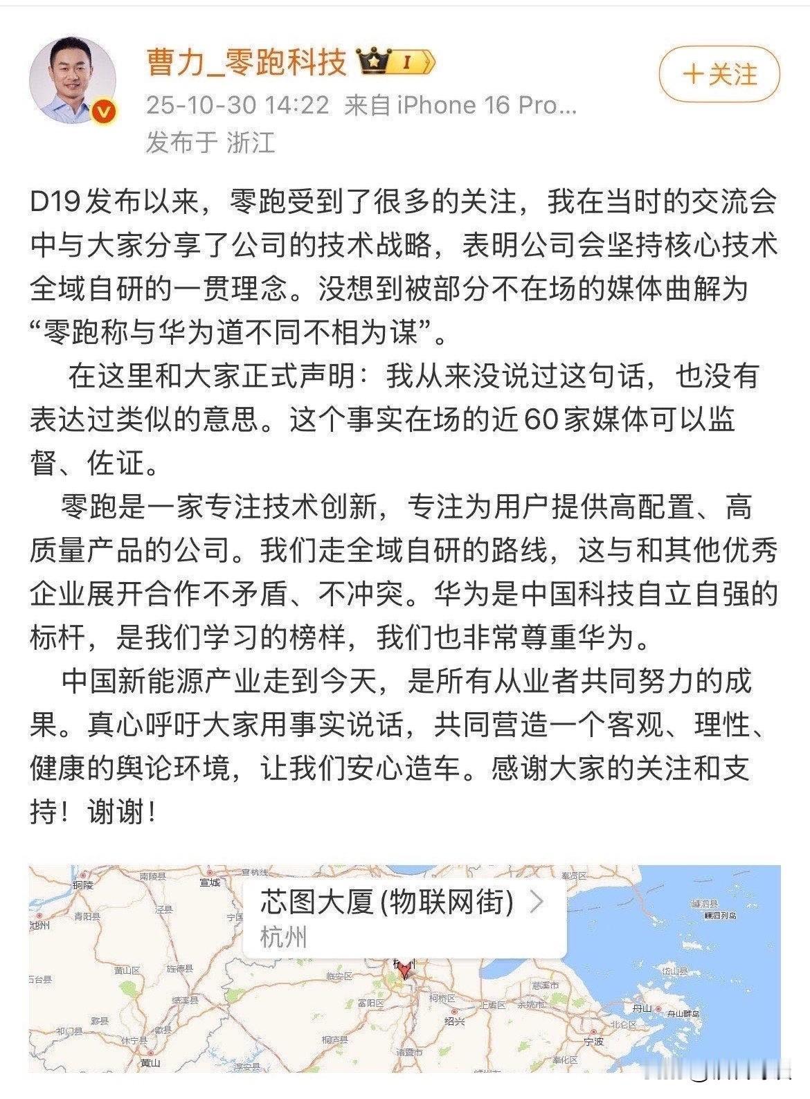 零跑与华为道不同不相为谋?零跑高级副总裁紧急回应! 近日,没想到因为零跑"不会搭载华为乾崑智驾系统",却把零跑副总裁推向了风口浪尖。 因为这句话被部分媒体曲解为"零跑与华为道不同不相为谋"! 零跑虽然对自己的全域自研持有信心,而且目前的策略也是使用自己得智驾系统,但也没必要如此"口出狂言"吧,毕竟谁也希望给自己多一条选择。 对此,零跑高级副总裁曹力尽力回应:"从来没有说过这句话,也没有表达过类似的意思"! 当然现如今,汽车行业百花争鸣,虽然鸿蒙智行位列第一梯队,但其他主机厂也有着自己独特的优势,选择权还是在于客户,你喜欢的不一定是别人喜欢的。
