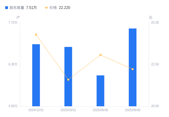 日期A股户数(户)流通A股户均持股数(股)户均持股市值(万元)2025-09-307506830019.5766.702025-06-305933637967.8887.592025-03-316889532698.4970.612024-12-316979232278.2478.382024-09-304515549144.90117.422024-06-305800337768.9372.352024-03-315817737632.5975.142023-12-315110642787.9075.672023-09-305215039376.2071.772023-06-306986529361.6967.74