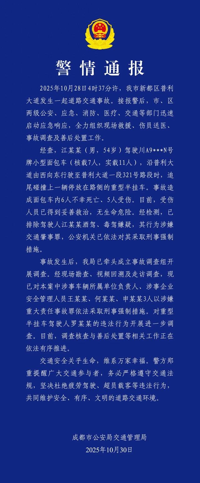 经查,江某某(男,54岁)驾驶川A9***N号牌小型面包车(核载7人,实载11人),沿普利大道由西向东行驶至普利大道一段321号路段时,追尾碰撞上一辆停放在路侧的重型半挂车。事故造成面包车内6人不幸死亡、5人受伤。目前,受伤人员已得到妥善救治,无生命危险。经检测,已排除驾驶人江某某酒驾、毒驾嫌疑,其行为涉嫌交通肇事罪,公安机关已依法对其采取刑事强制措施。