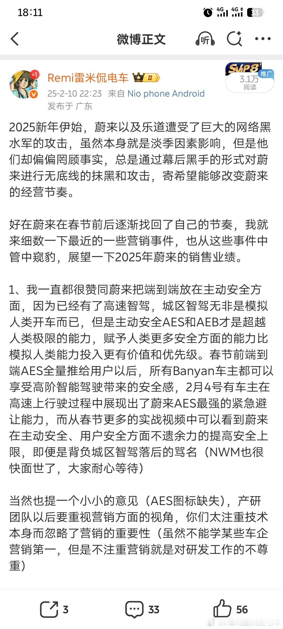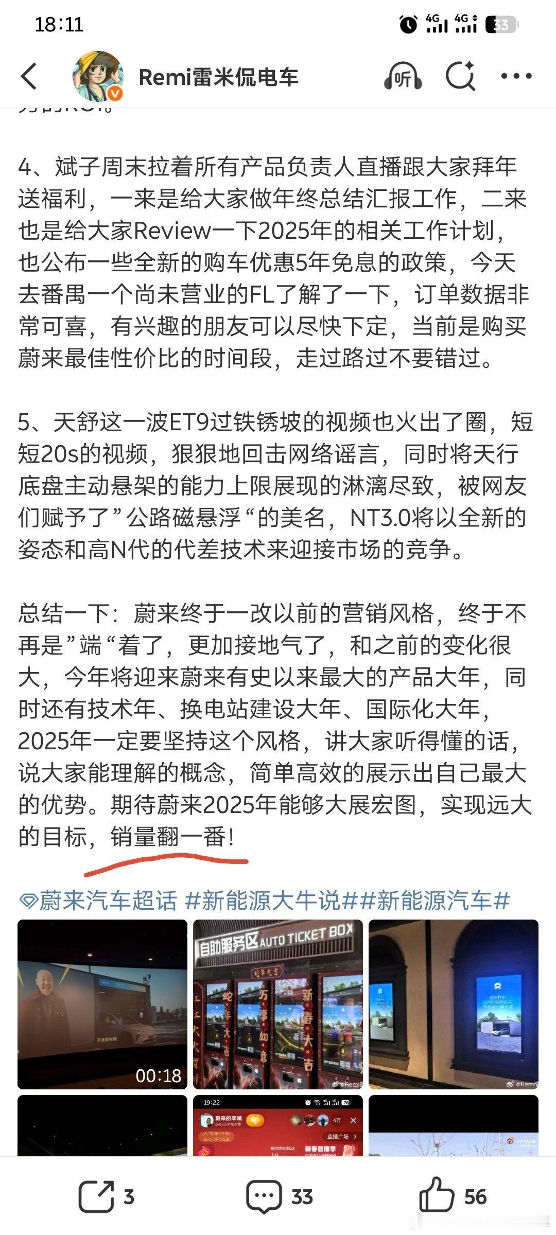 大多数人的认知都跟他一样,而我一直坚信蔚来2025年必定能大卖,因为我相信蔚来的商业模式,也知道蔚来长期投资研发的意义,而2025年是就开始进入丰收的时间,这也是我们能够打逆风局一点也不落下风的根本原因。