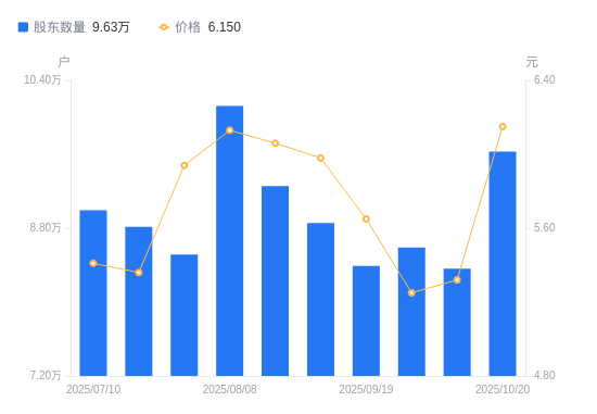 近一年(2024年10月31日至2025年10月20日),贵州百灵A股股东户数从8.83万户,增加至9.63万户,增幅9.03%,区间股价上涨64.00%。