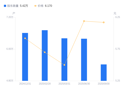 日期A股户数(户)流通A股户均持股数(股)户均持股市值(万元)2025-09-30542069736.976.012025-06-30638968260.335.112025-03-31640528240.214.532025-02-28671327862.154.482024-12-31660877986.474.732024-09-30655058057.434.472024-06-30676217805.303.722024-03-31708537449.264.282024-02-29717667354.494.432023-12-31728727242.874.35