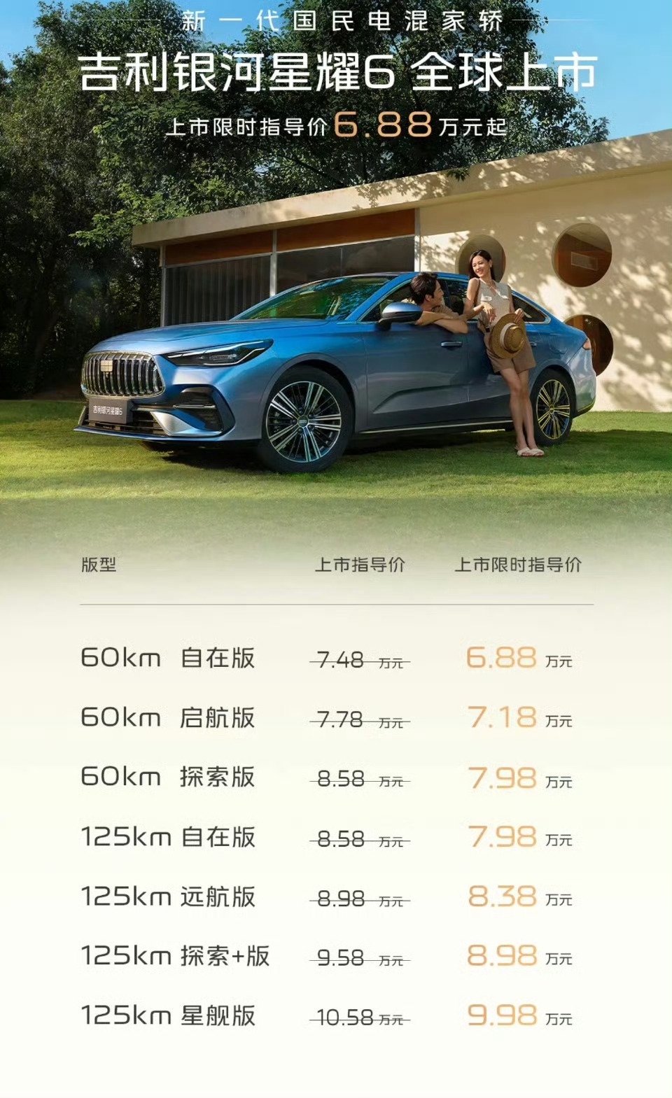 吉利银河星耀6限时指导价6.88万元起吉利银河星耀6太懂国民需求了!6.88万起的新一代电混家轿,沁釉蓝、丝锦银颜值能打,内饰还有三种主题。