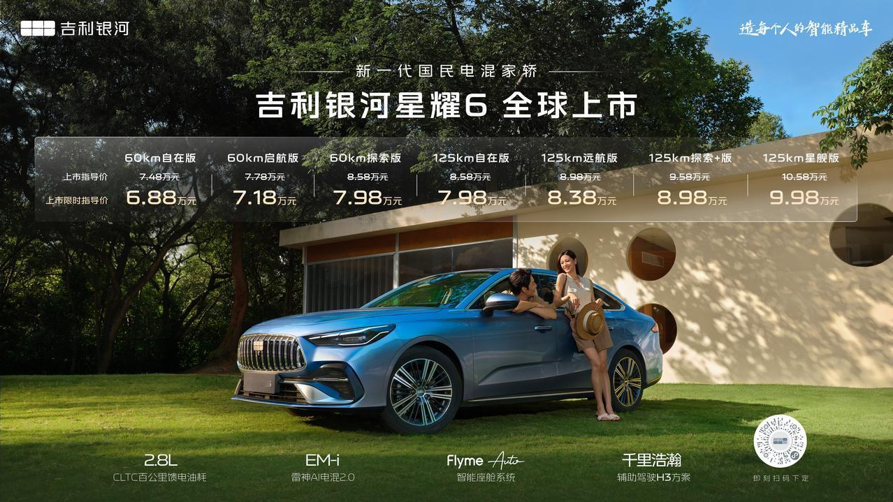 看完吉利银河星耀6上市发布会了,这次一共推出了7个版型,上市限时指导价为6.88万元-9.98万元,价格很亲民,而且配置不缩水,配备银河Flyme Auto智能座舱系统、千里浩瀚H3辅助驾驶系统、神盾电池安全系统、棉花糖座椅、10.2英寸仪表、倒车影像等实用功能,用户购车成本虽低但丝毫不影响品质。 买车省了,用车也要省。银河星耀6搭载新一代雷神AI电混2.0系统,可以根据个人的驾驶习惯、路况、环境湿度、温度等各种条件,提前规划出最省的能耗方案,在CLTC工况下能实现2.8L/100km馈电油耗,每公里用车成本低至2毛钱。125km超长纯电续航和1700公里的CLTC综合续航,覆盖日常通勤与长途场景。 耐用也是家轿车的必须品质。看发布会的时候,就被那个“5×24小时不间断极限试炼”震撼到,吉利银河星耀6高强度地模拟了用户几年甚至十几年的用车磨损,横跨5城全程超5000公里,连续5天120小时高强度行驶,始终保持零故障、零异响、零衰减,这样的可靠性真的很值得肯定了。吉利星耀6,在A级家轿这块儿真的很有竞争力了,够省,够耐用。