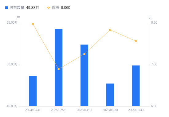 日期A股户数(户)流通A股户均持股数(股)户均持股市值(万元)2025-09-30498807324618.70261.642025-06-30477228339297.10282.632025-03-31523837309107.75239.562025-02-28542478298485.98220.582024-12-31486082333116.79282.152024-09-30508408318488.45272.312024-06-30472095342986.22330.302024-03-31449661360098.11322.652024-02-29474200341463.68270.442023-12-31473714341814.00209.87
