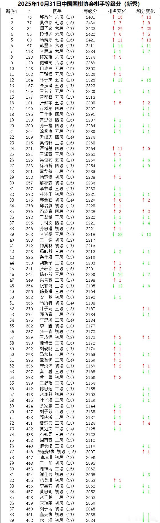注:本榜仅供参考,具体以围棋协会颁布为准。