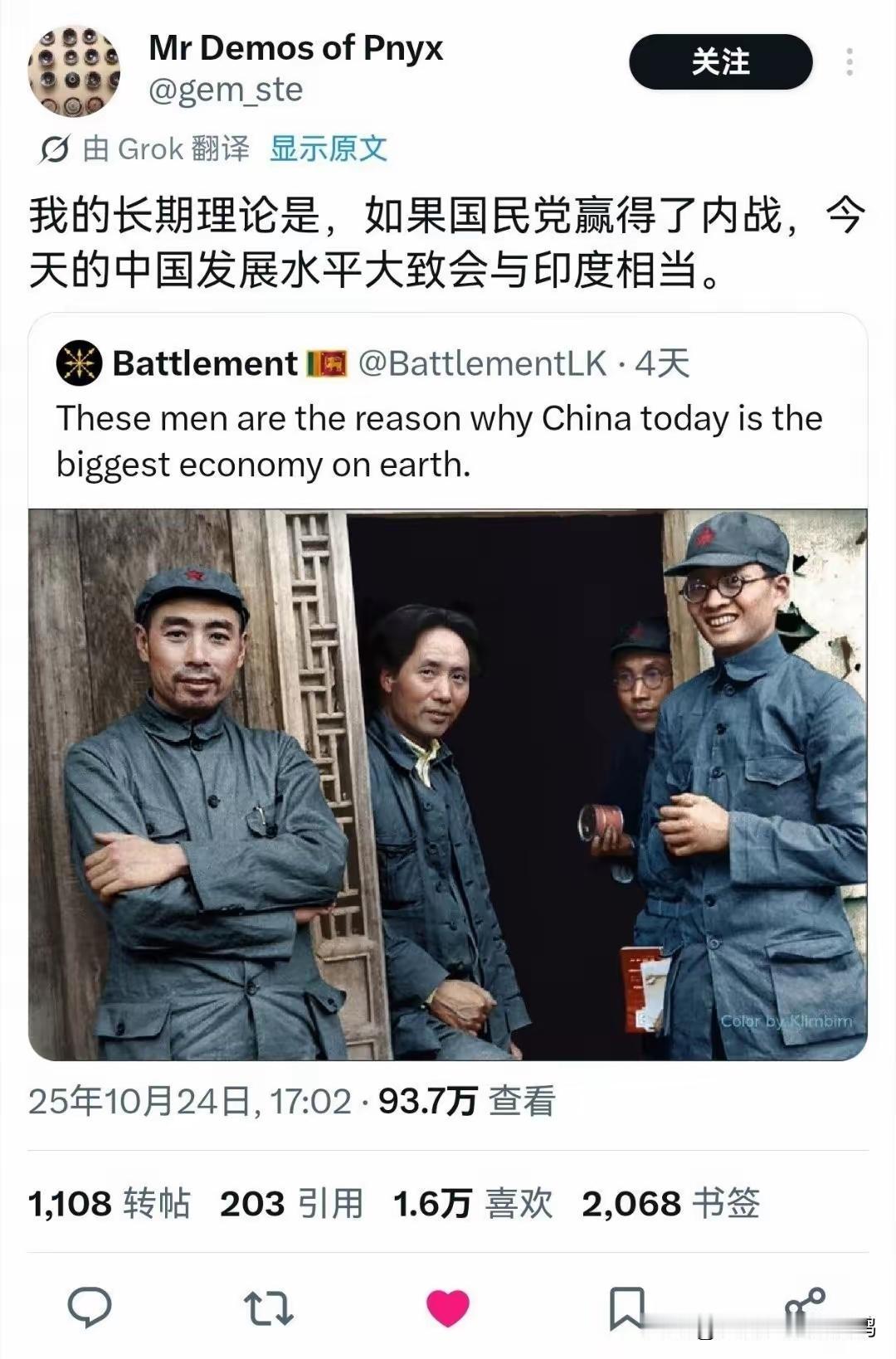 没有共产党就没有新中国!外国人在新中国成立76年后也终于认识到了这一点。 有意思的是我们国内居然还有一大批人是蒋粉国粉,为蒋介石国民党洗地。其实他们也不是真的喜欢国民党蒋介石,他们只是不喜欢新中国。 这才是本质。 点右上角关注我,我们一起去看这个魔幻的世界