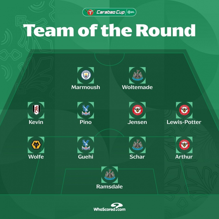 直播吧10月31日讯英联赛杯第4轮比赛已经全部结束,今日官方公布了该轮最佳阵容,纽卡和布伦特福德各有3将入选,马尔穆什、沃尔特马德、格伊在列。