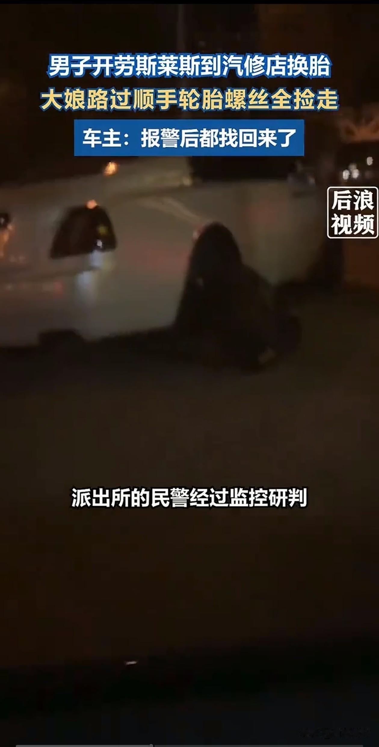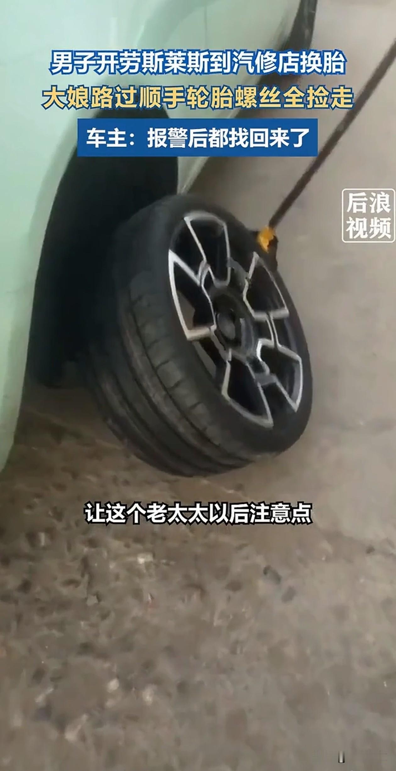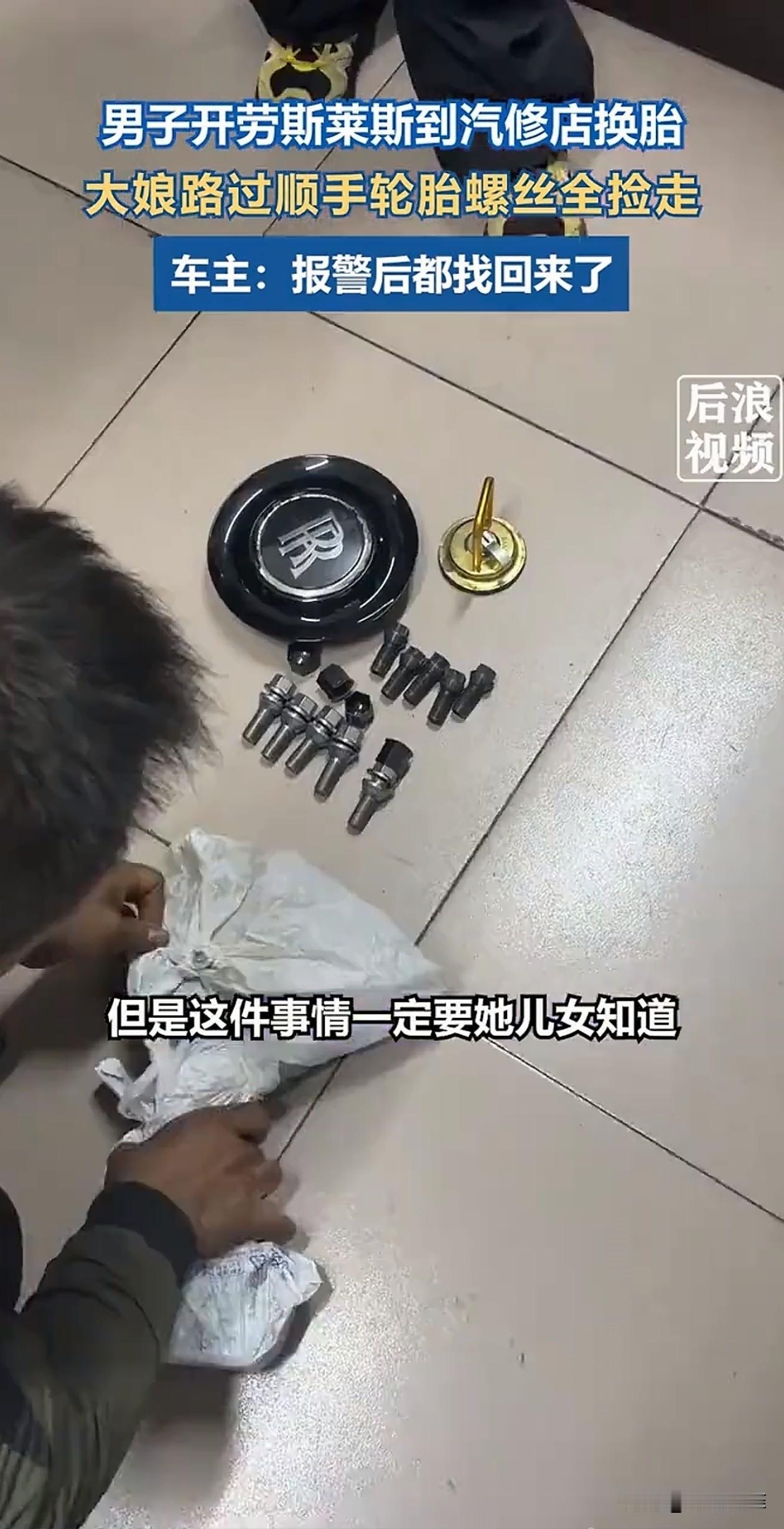 一辆劳斯莱斯在汽修店更换轮胎,拆下的螺丝和盖子放在了旁边,一大娘路过看见,以为是废品就顺手捡走,结果她还没来得及卖,警察就找上了门。车主:可以不追究。 内蒙古,维修工按流程把轮胎上的螺丝和防尘盖拆下来,随手放在店门口的台阶上,转身去拿新轮胎,就这么一会儿的功夫,那些零件全没了。 车没办法修,也开不走,店主和维修工着急的不行,赶紧调了监控,发现是一位挎着布兜的大娘路过,顺手捡走了。 大娘平时靠捡废品为生,不知道这些东西的价值。劳斯莱斯的轮胎螺丝是特制的,单颗要400元,一套下来得几千元,而且普通汽修店买不到,要专门定制。 车主报警后,民警很快通过监控找到了大娘,大娘也很配合把零件全还了回来,还一个劲解释自己真不知道这么金贵。 车主得知情况也表示不追究,只希望老人儿女能多留意,避免再出这种误会。 有网友认为大娘是无心之失,她靠捡废品为生,习惯性地将地上的金属当作废品,不是故意拿的,可以理解。 有网友夸赞车主格局大,没有和大娘计较,还希望大娘的子女能更关注她,这种宽容大度的态度真的很难得。 在大娘眼里,金属件就是能换钱的废品,是生活习惯,但在车主和汽修店看来。这是豪车不可或缺的一部分,价值不菲。 这场误会里没有争吵,反而是互相理解,大家的处理方式都充满人情味,让人感到温暖。