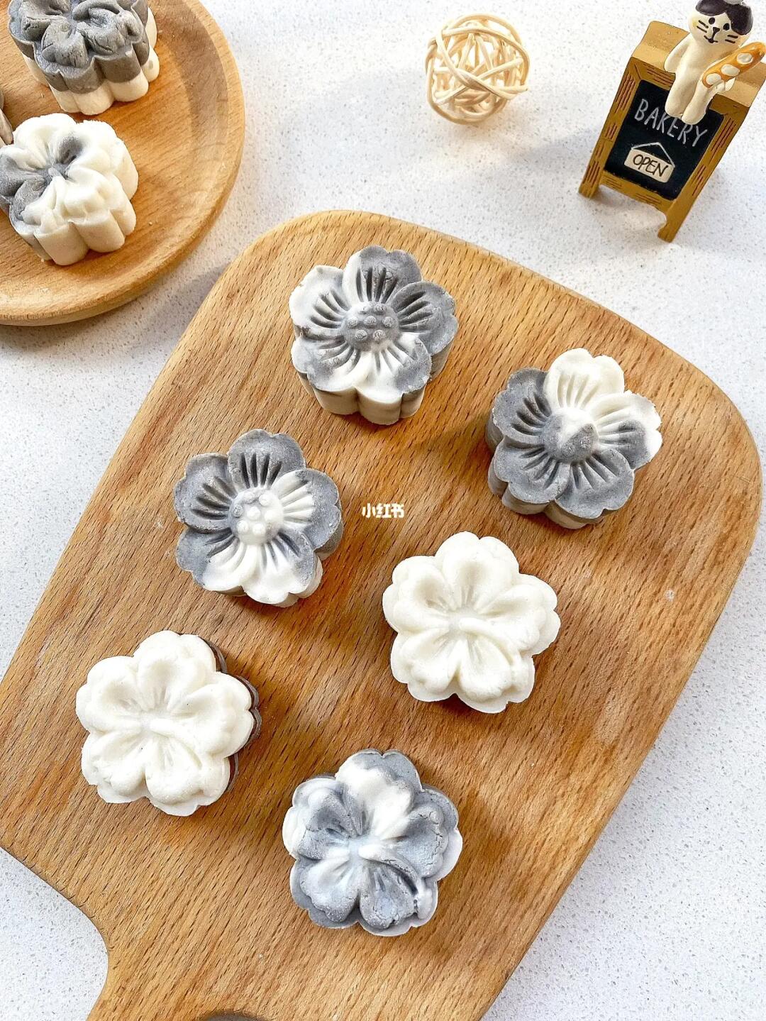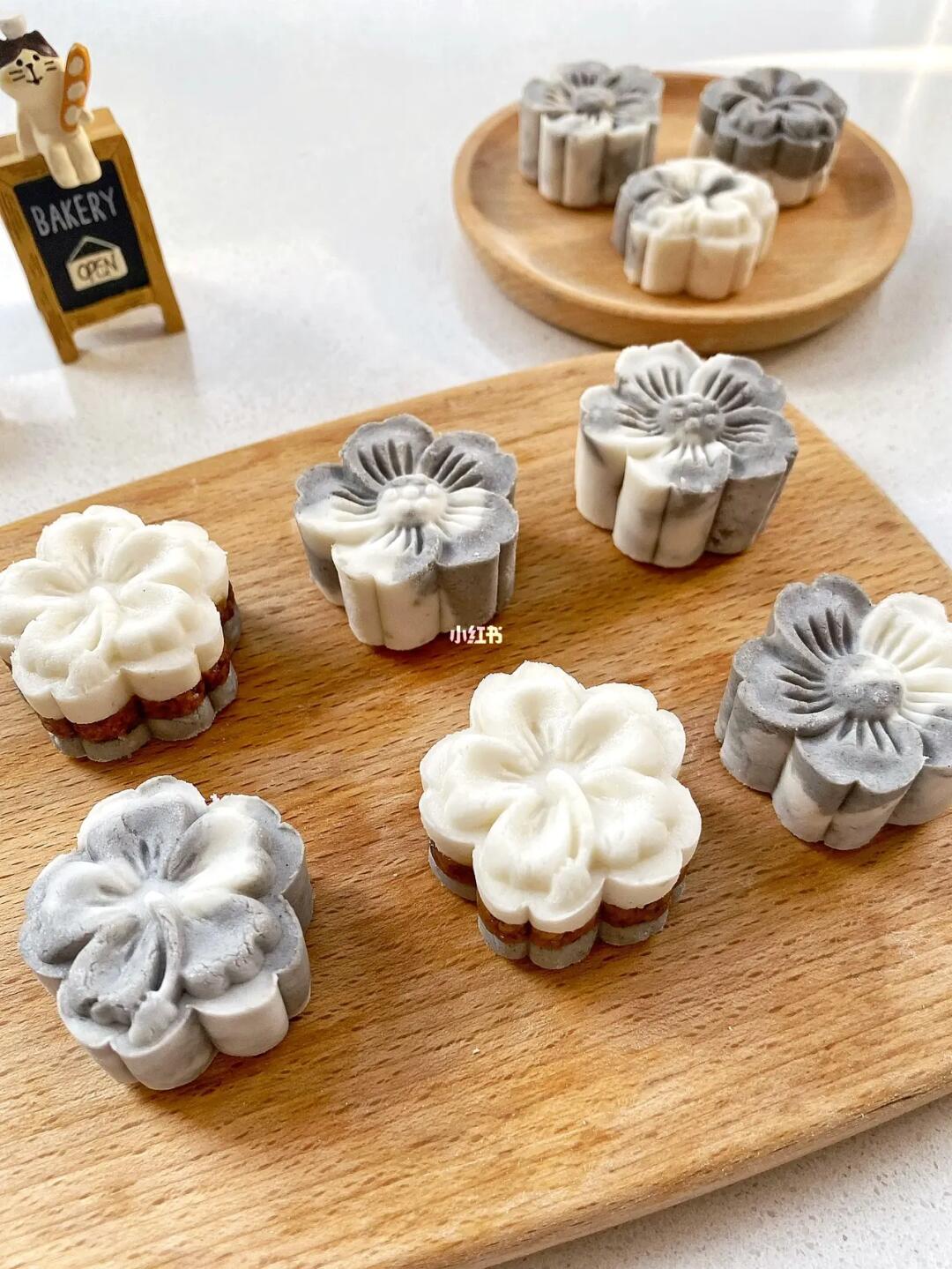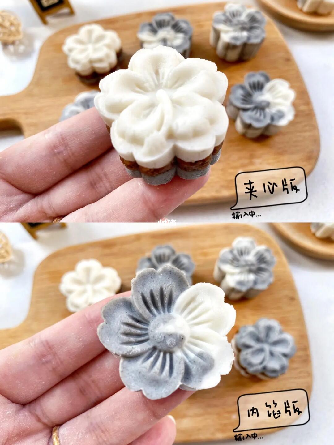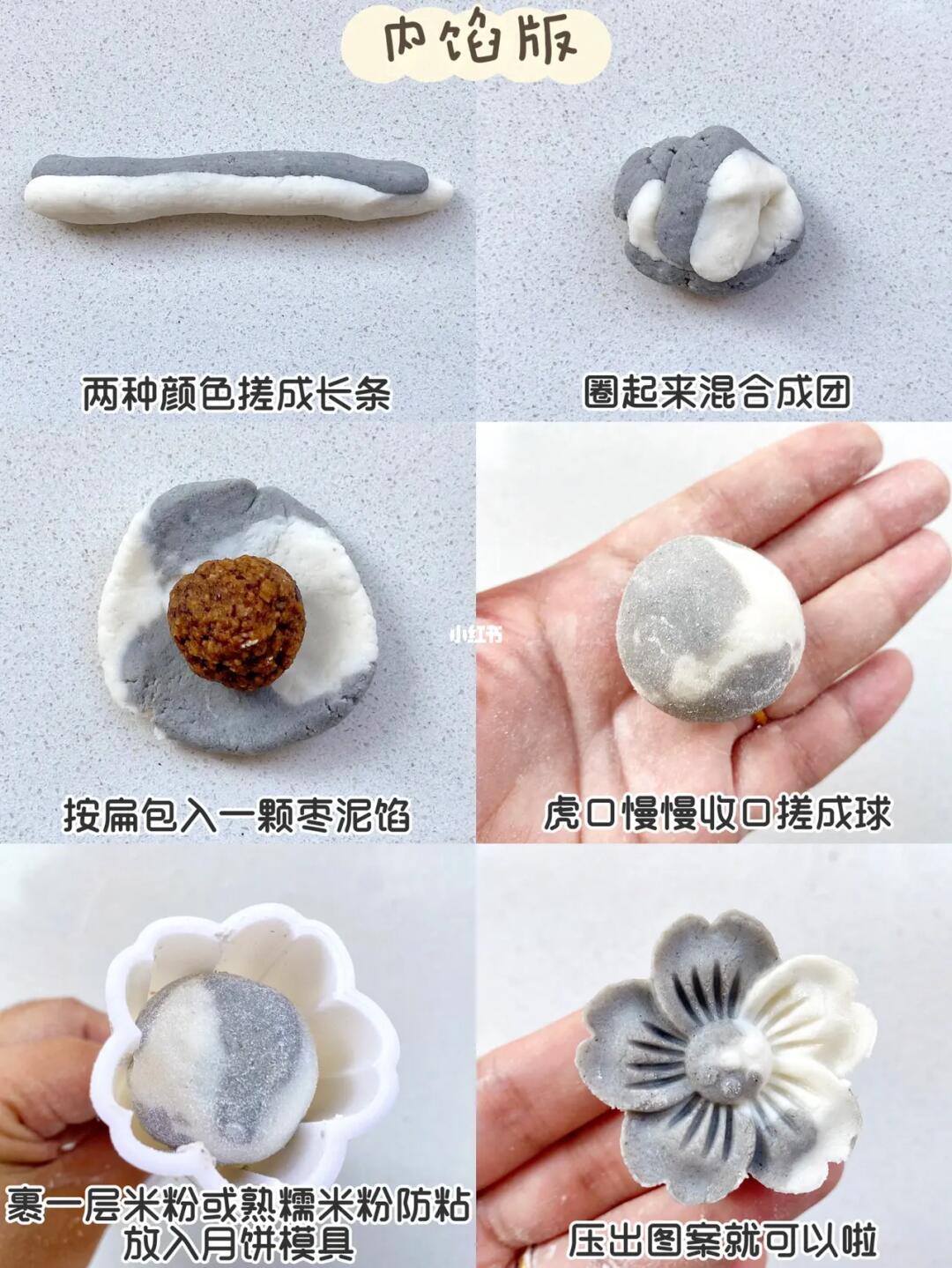 4⃣️包馅版:两种颜色的山药搓成条,在混合起来按扁包入馅料,虎口慢慢收口,搓圆,放入模具压出形状就好了。