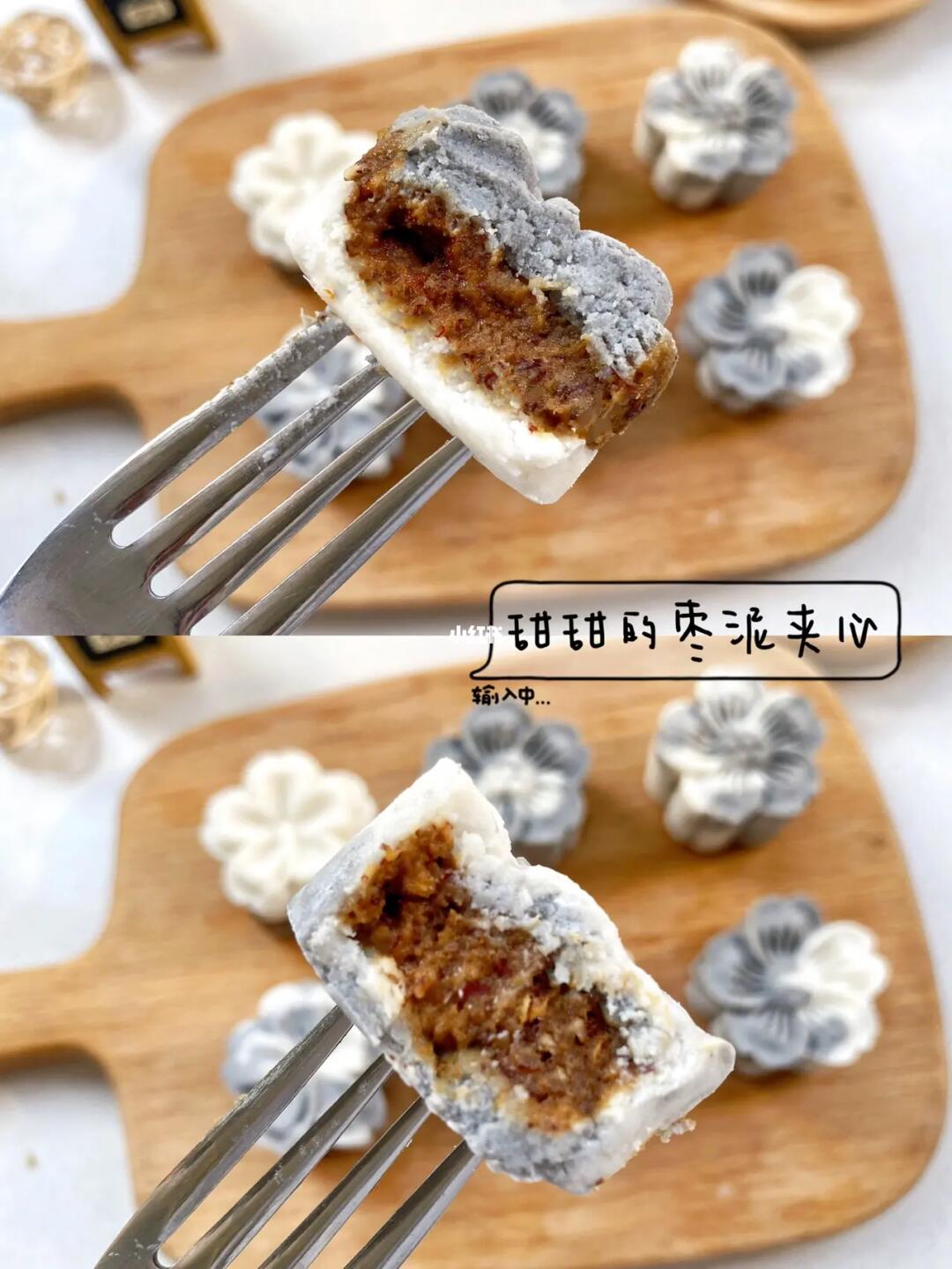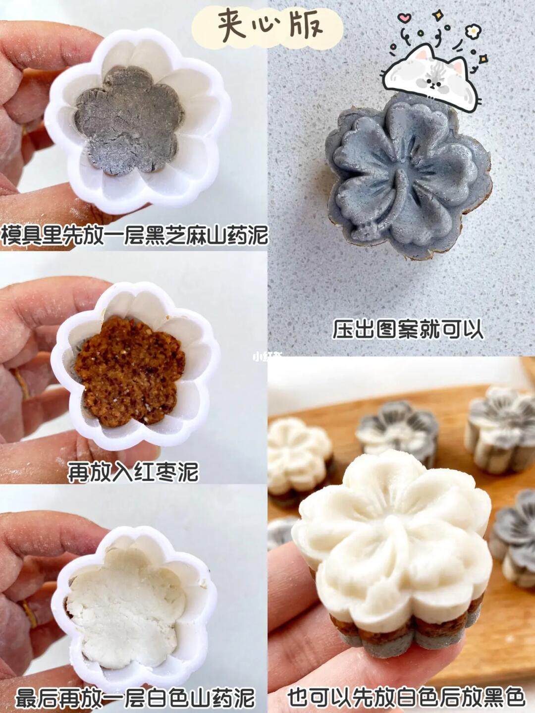 5⃣️夹心版:先放一层山药泥,再放一层枣泥,最后再放一层山药泥,压出形状就好了。