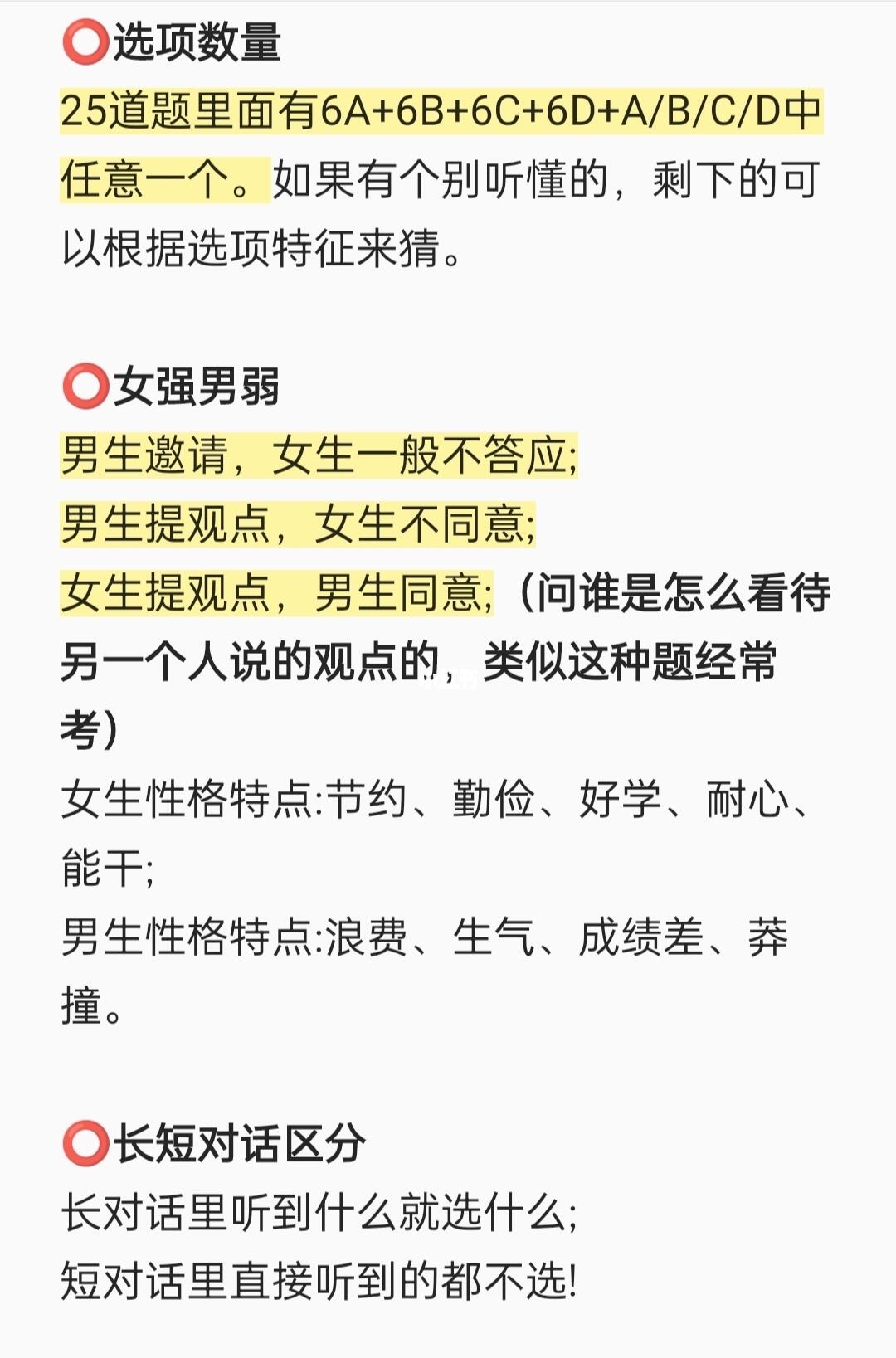 ⭕预读选项猜内容,一般情况下四个选项一定有个你能看个大概其的句子,此时发挥你强大的脑洞,脑补出来一篇听力内容来,之后听的时候实时调整,有时候就突然听懂了!