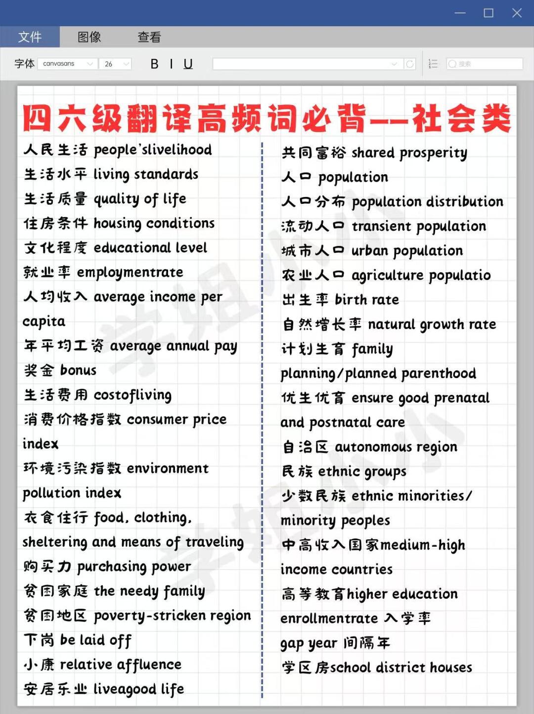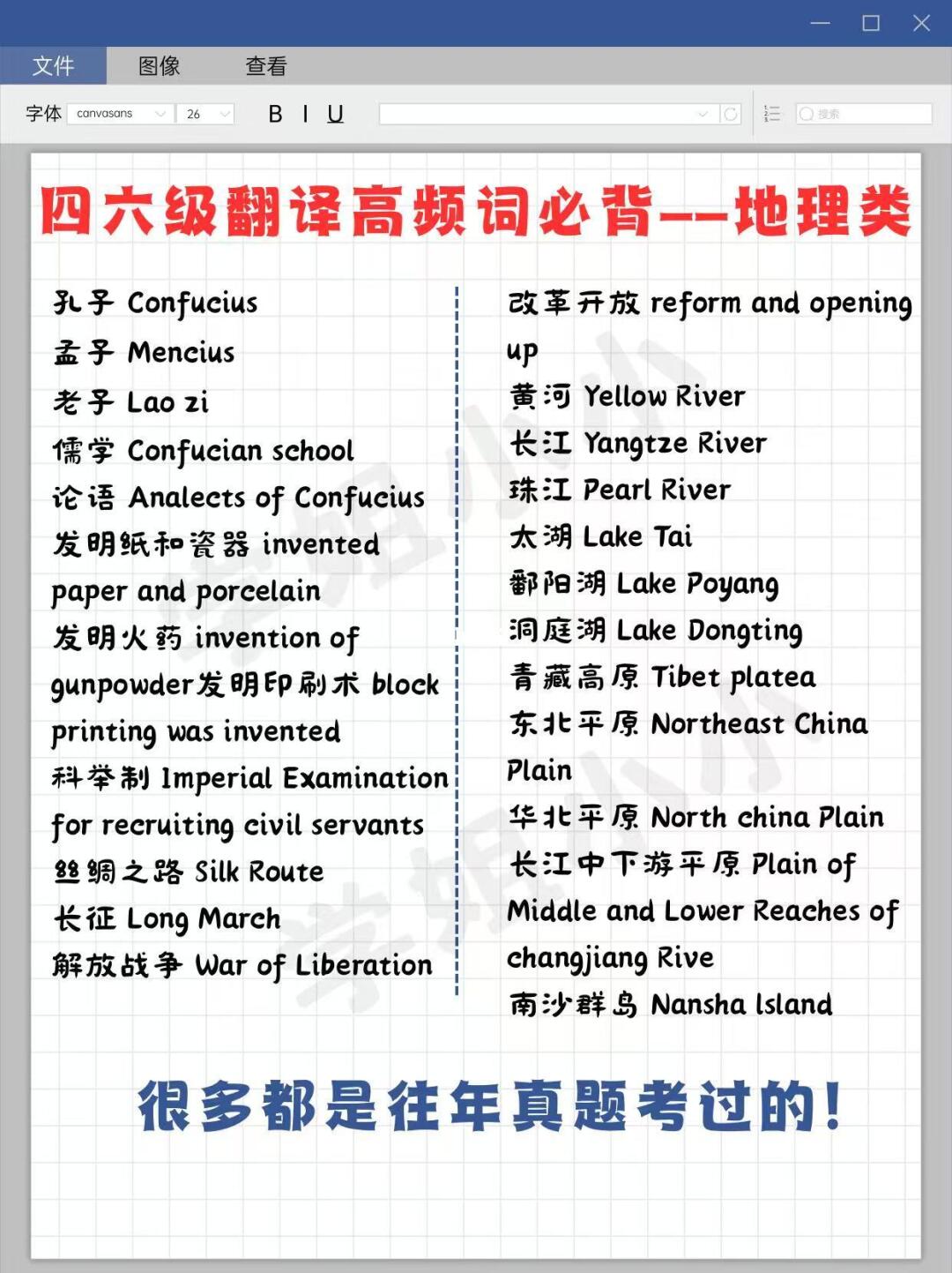 四/六级级高频词里面有很多都是历年考过的真题,而且翻译每年考的话题都差不多,无非就是传统节日、交通、经济等等这些话题,重复率会很高。