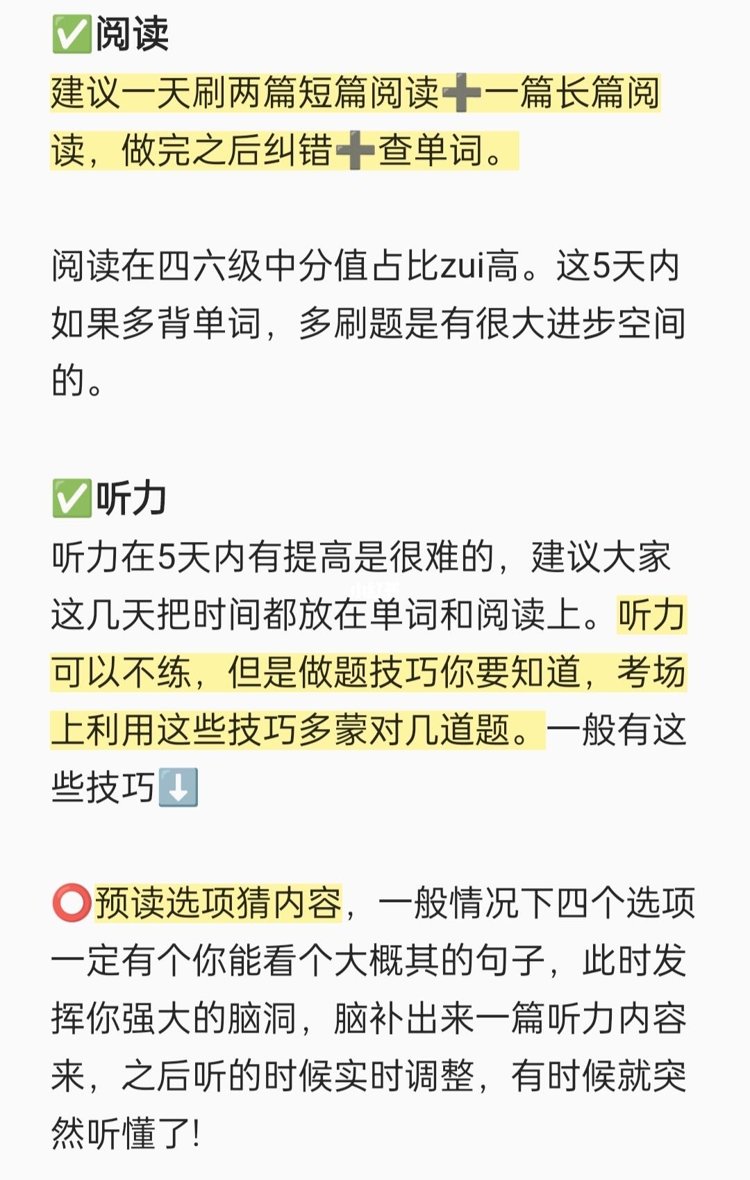 听力在5天内有提高是很难的,建议大家这几天把时间都放在单词和阅读上。听力可以不练,但是做题技巧你要知道,考场上利用这些技巧多蒙对几道题。一般有这些技巧⬇️