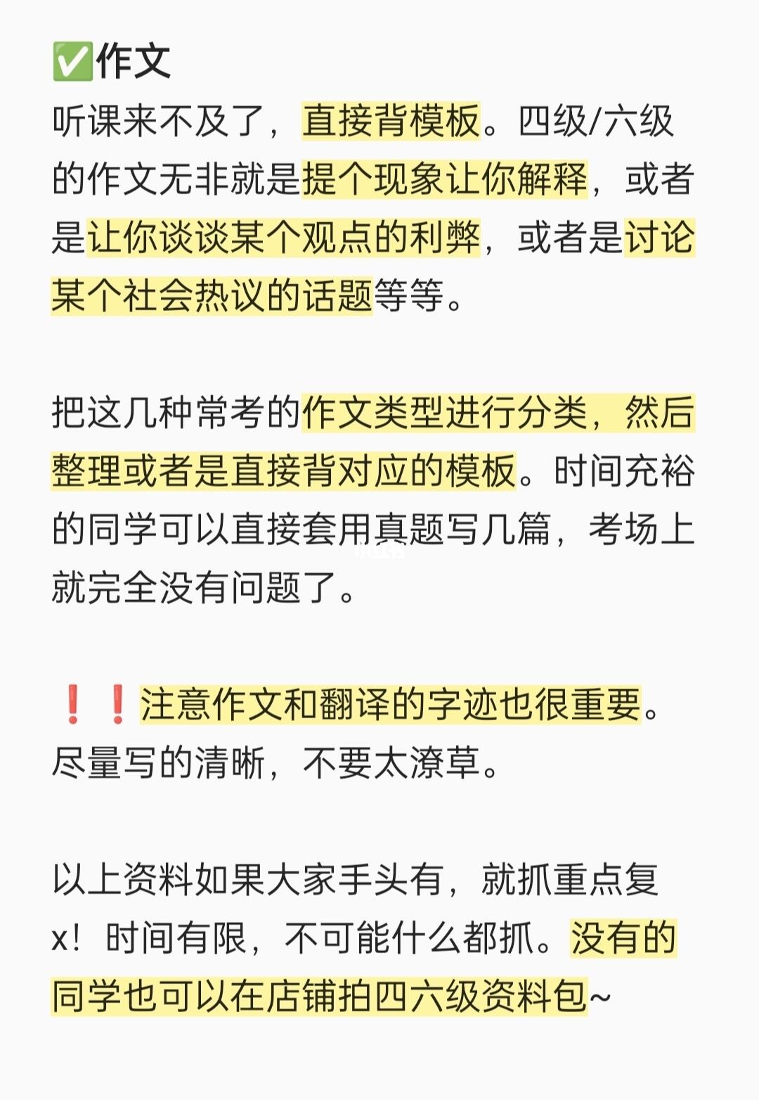 听课来不及了,直接背模板。四级/六级的作文无非就是提个现象让你解释,或者是让你谈谈某个观点的利弊,或者是讨论某个社会热议的话题等等。