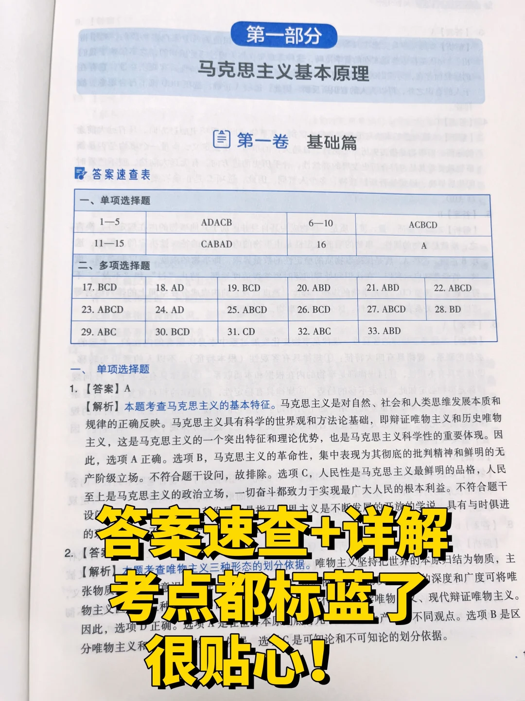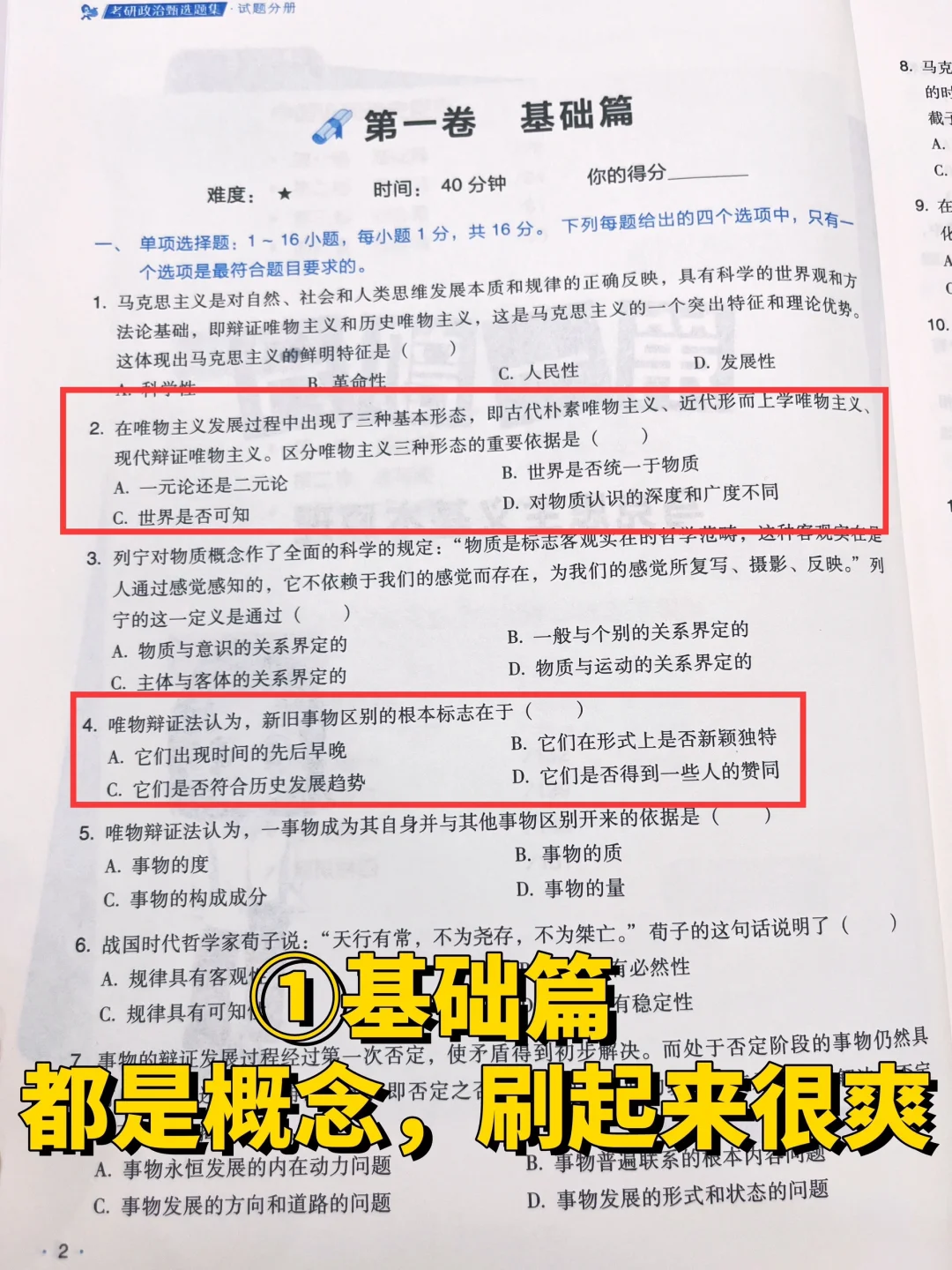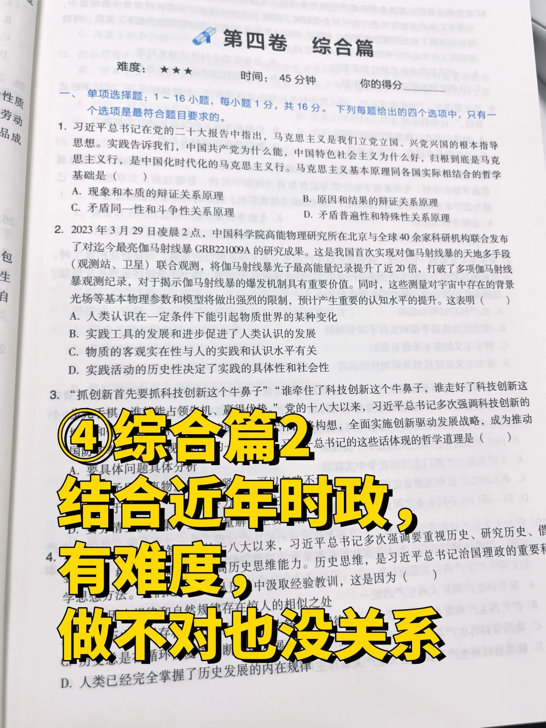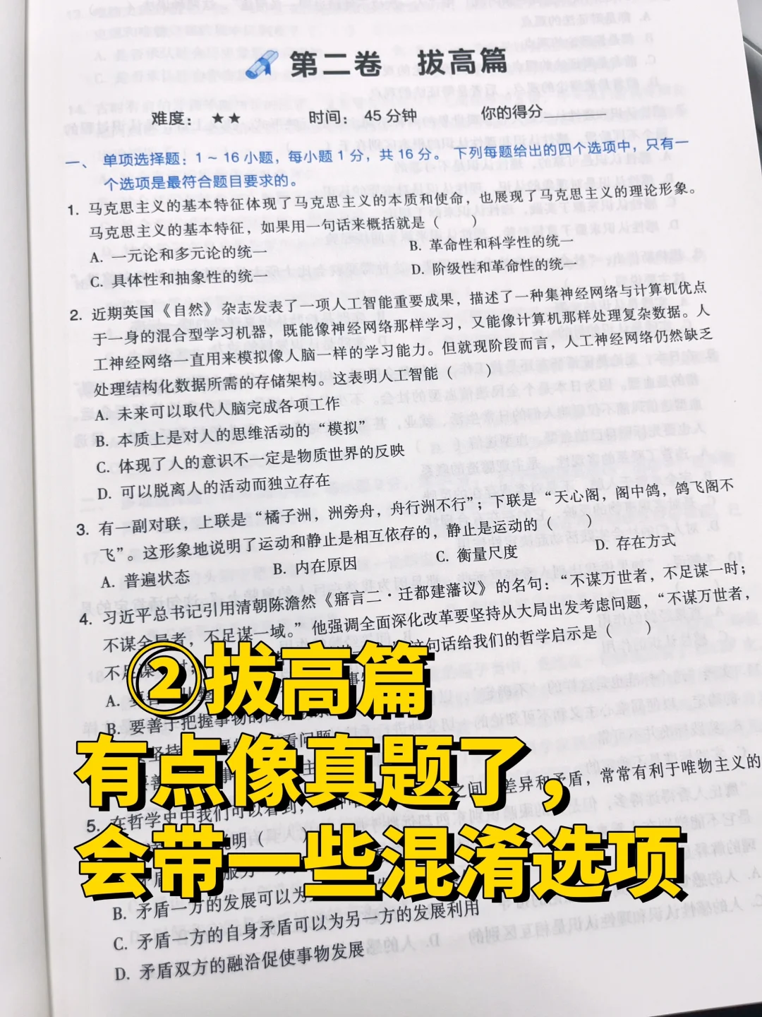 有同学问《考研政治甄选题集》这本书怎么样,收到书后仔细看了一遍,这本书是纯选择题题集,内容设置上,比较紧密结合新大纲和热点事件,总共有24套仿真题;题目质量上,考察比较全面,难度贴近真题,题目很新,解析讲解的也比较详细。在刷题阶段,这本书会帮助分析做考研政治单项和多项选择题中经常遇到的问题,让我们学会易混淆知识点。这本书的内容编写主要分为基础、拔高、综合篇以及模拟卷四个结构👇👇