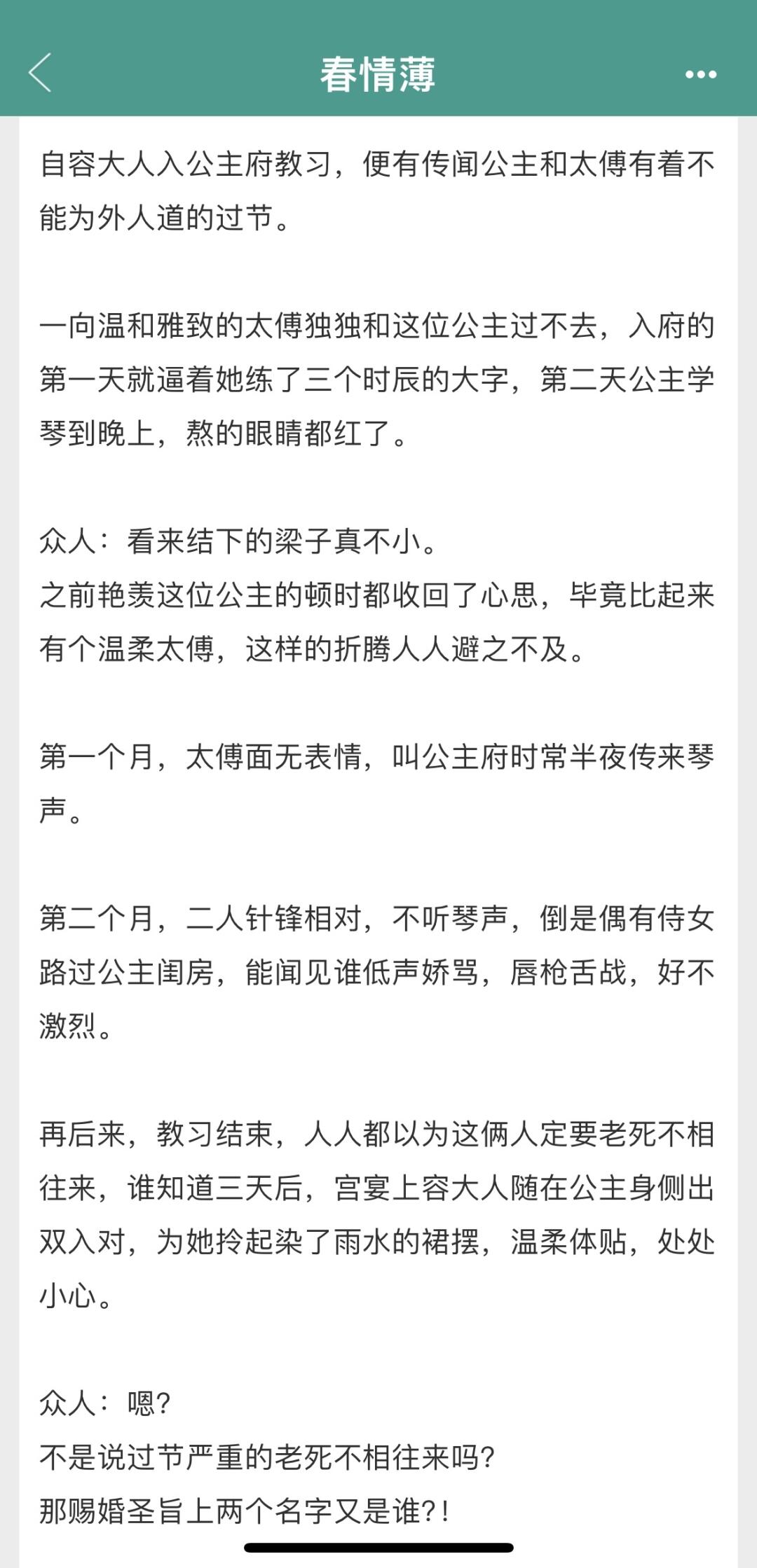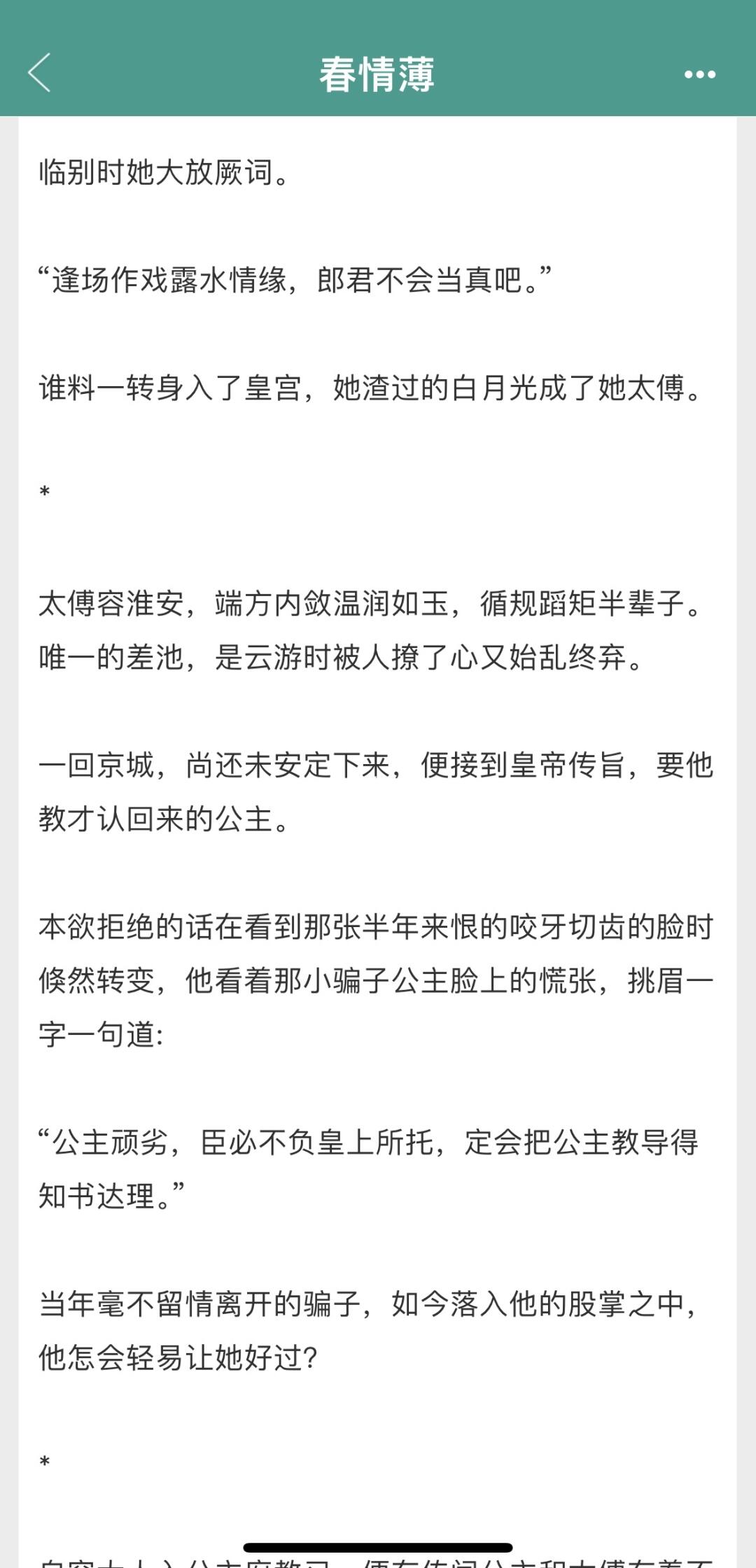 原因无他,皇帝为她寻的太傅,容家的高岭之花,是年少她在外云游,有过一 段露水情缘的穷书生。