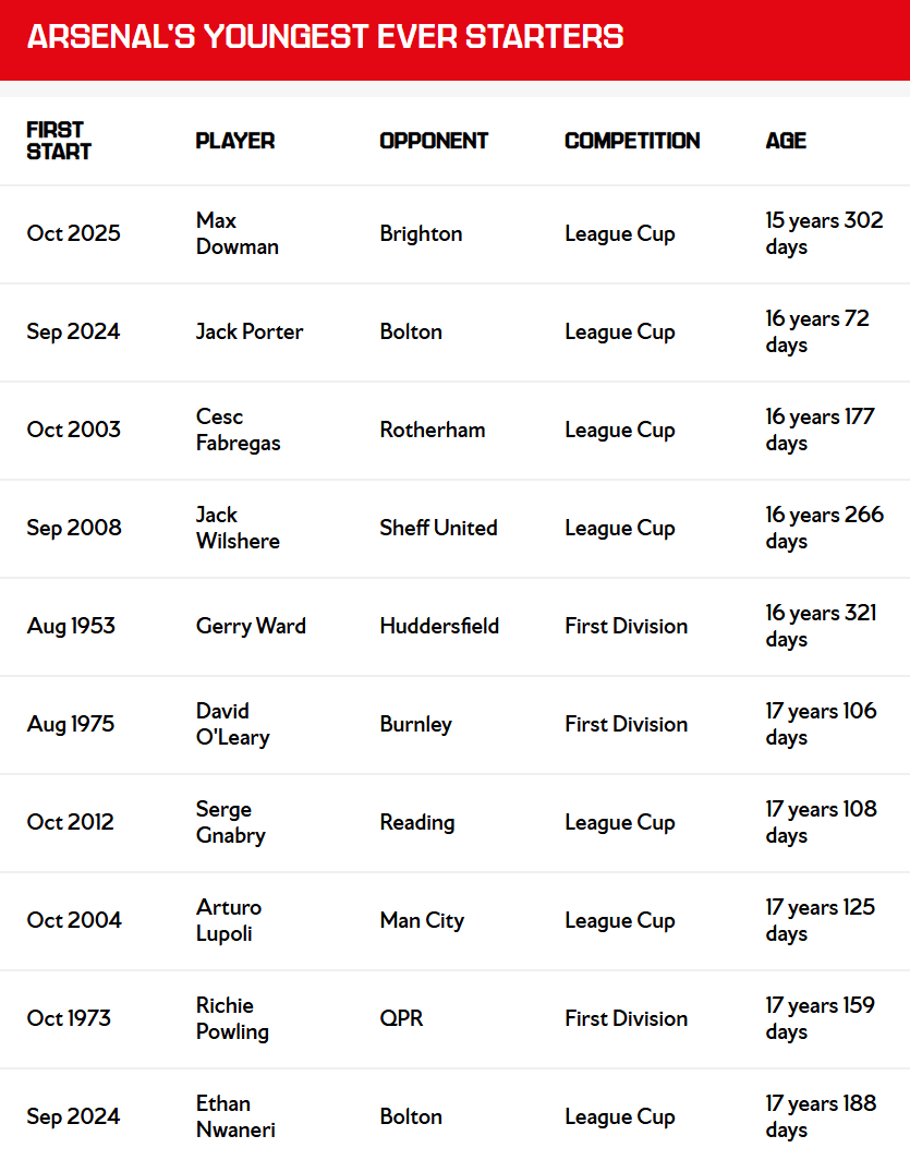 虎扑10月30日讯在英格兰联赛杯第四轮战胜布莱顿的比赛中,道曼首次代表阿森纳首发出场,成为俱乐部历史上最年轻的首发球员。阿森纳官方盘点队史最年轻首发/出场/进球球员纪录。