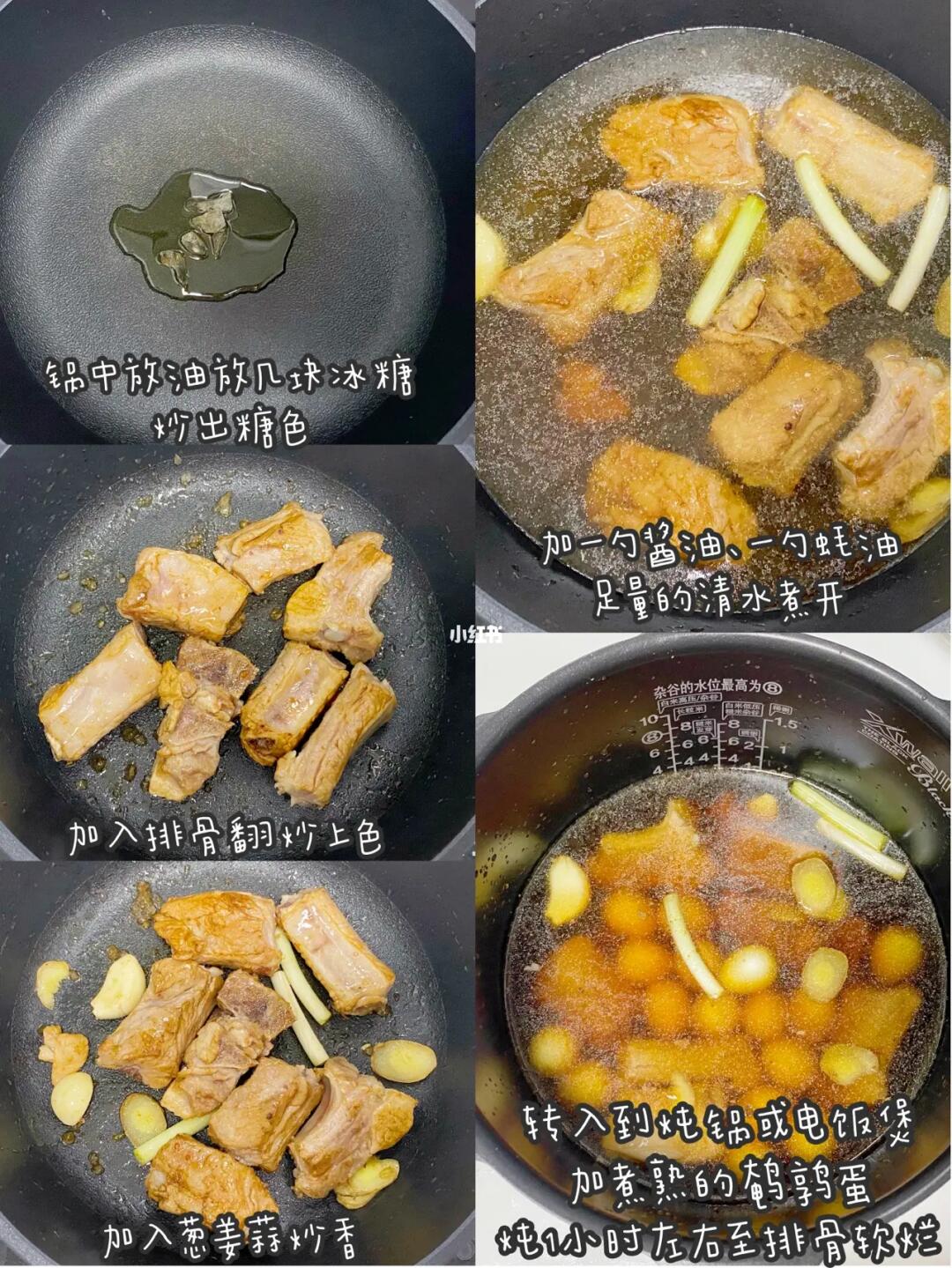 3⃣️加水煮开后转到电饭锅或者炖锅,加入煮好的鹌鹑蛋炖煮约1个小时左右,具体时间根据排骨的软烂程度为准。