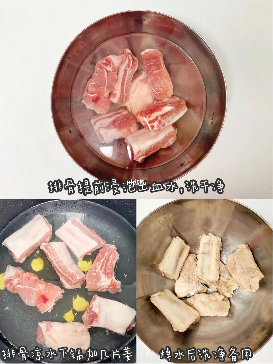1⃣️排骨凉水下锅,加几片姜焯水备用。
