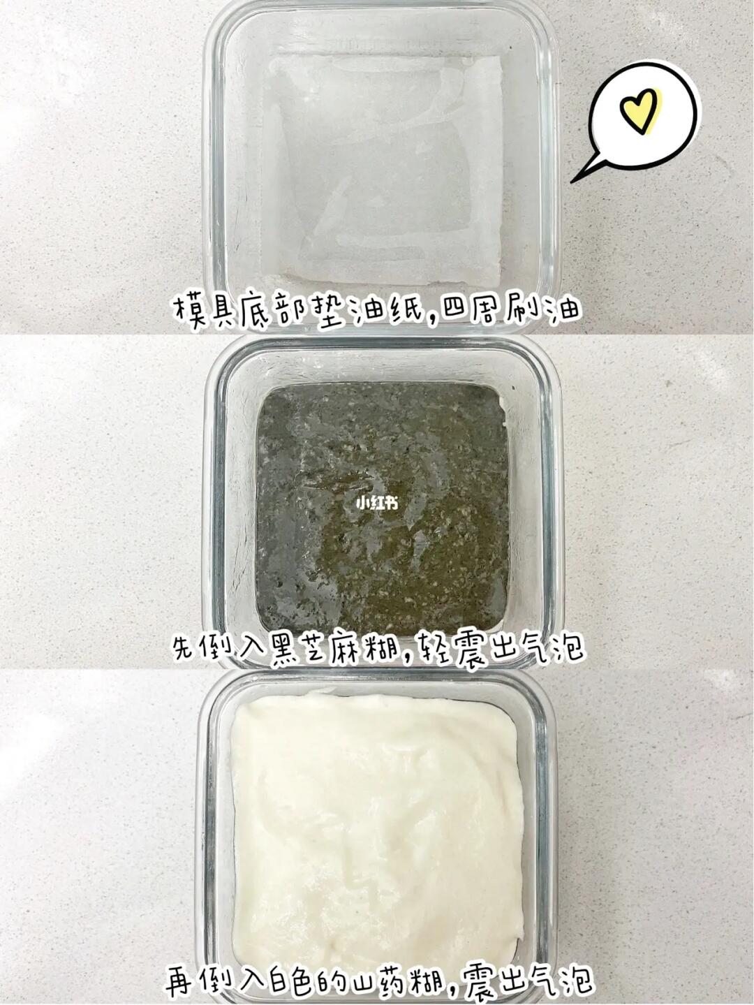 3⃣️模具铺油纸四周刷油,倒入黑芝麻糊,震出气泡。再倒入山药糊,滴几滴黑芝麻糊,用牙签随意搅和几下,大理石纹就出来了。