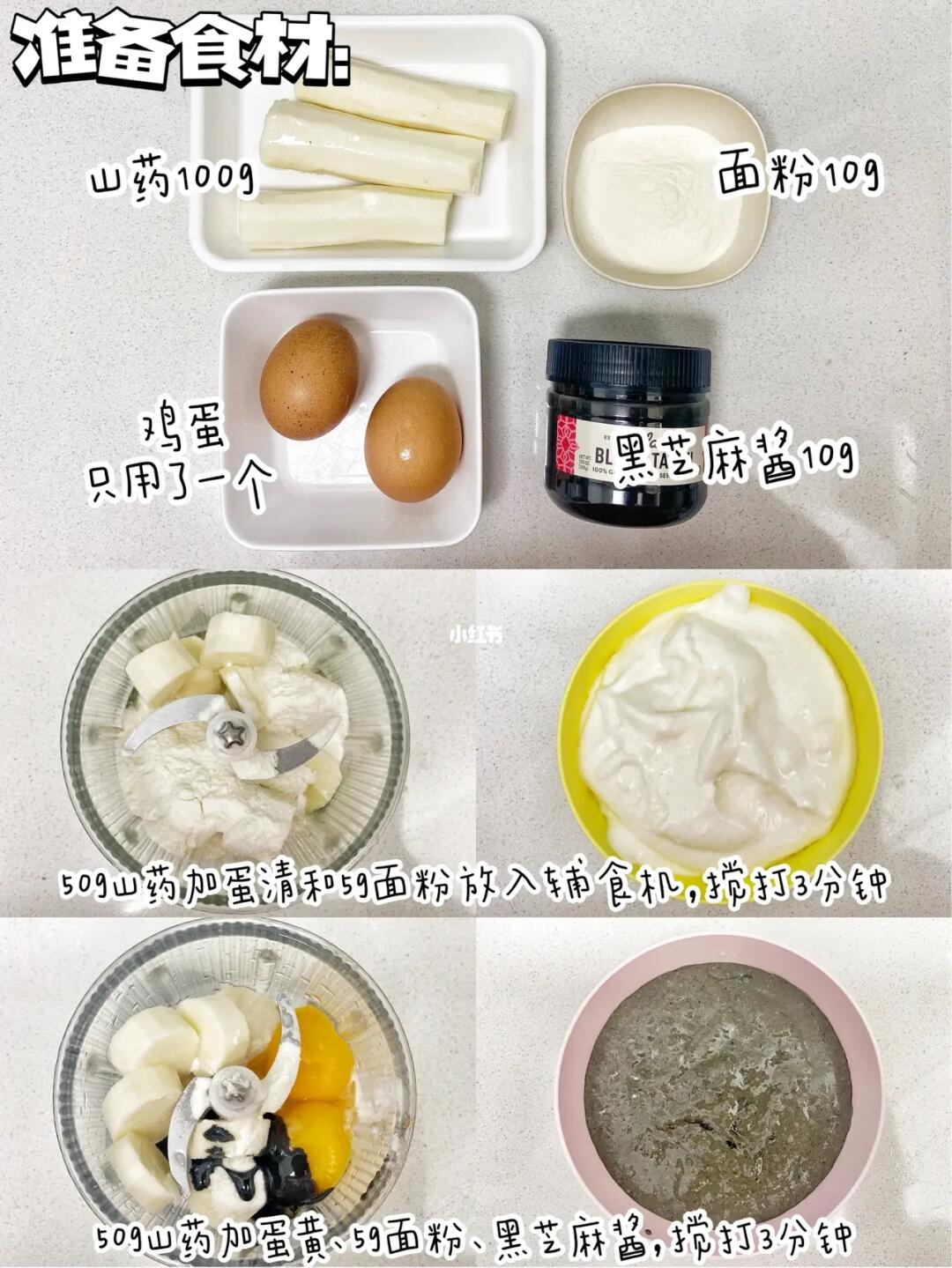 1⃣️50g山药、5g面粉和蛋清一起放入辅食机,搅打约3分钟,断断续续的打呀,不然会烧坏机器。