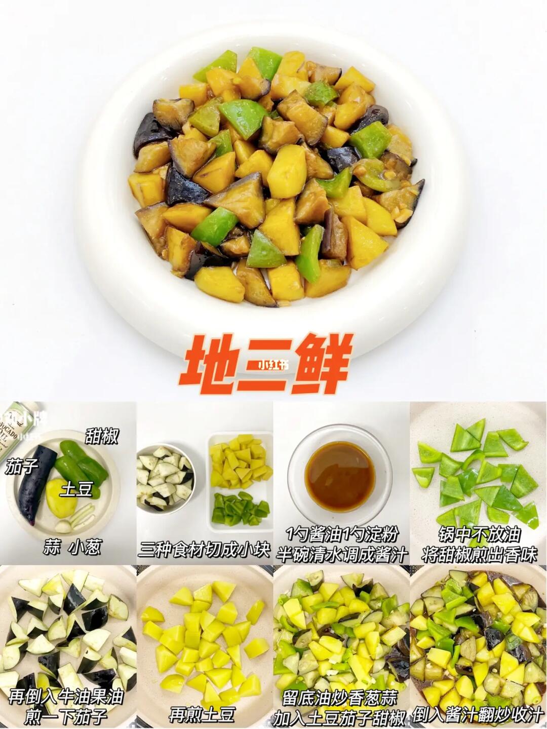 1.食材全部切小块,青椒放入锅中煸炒一下,茄将茄子土豆煎熟备用。