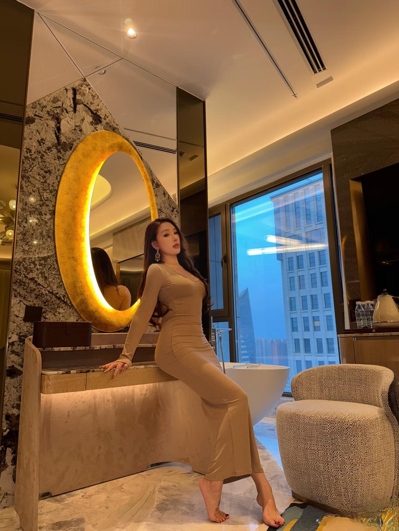当这袭裸色长裙贴合身体时,我竟觉得自己与这空间的奢雅融为一体。金属圆环镜的暖光勾勒着裙边,每一寸剪裁都像是为此刻的姿态量身定制。踩在微凉的地面,却因这一身的妥帖生出随性的慵懒——不必刻意,便在大理石与柔纱的映衬里,成了自己喜欢的那种精致又松弛的模样。