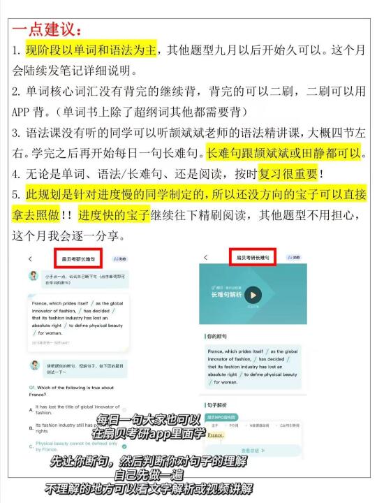 [三R].语法课没有听的同学可以听颉斌斌老师的语法精讲课,大概四节左右。学完之后再开始每日一句长难句。长难句跟颉斌斌或田静都可以。