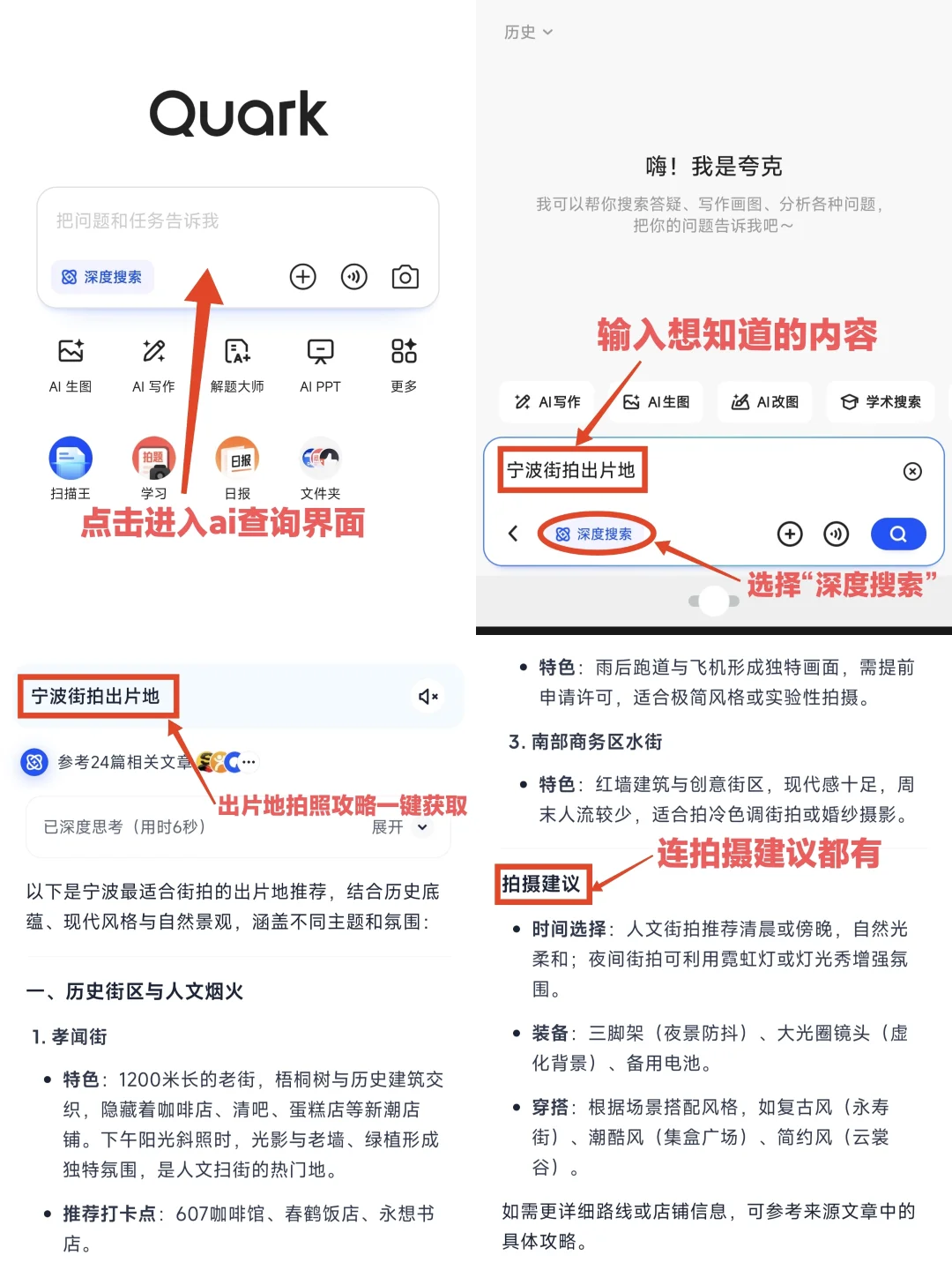 ✅操作:夸克搜索框开启「深度搜索」模式,输入「宁波街拍出片地」,秒出十几个出片地打卡攻略拍照时间,装备建议,如何前往,一键get❗️