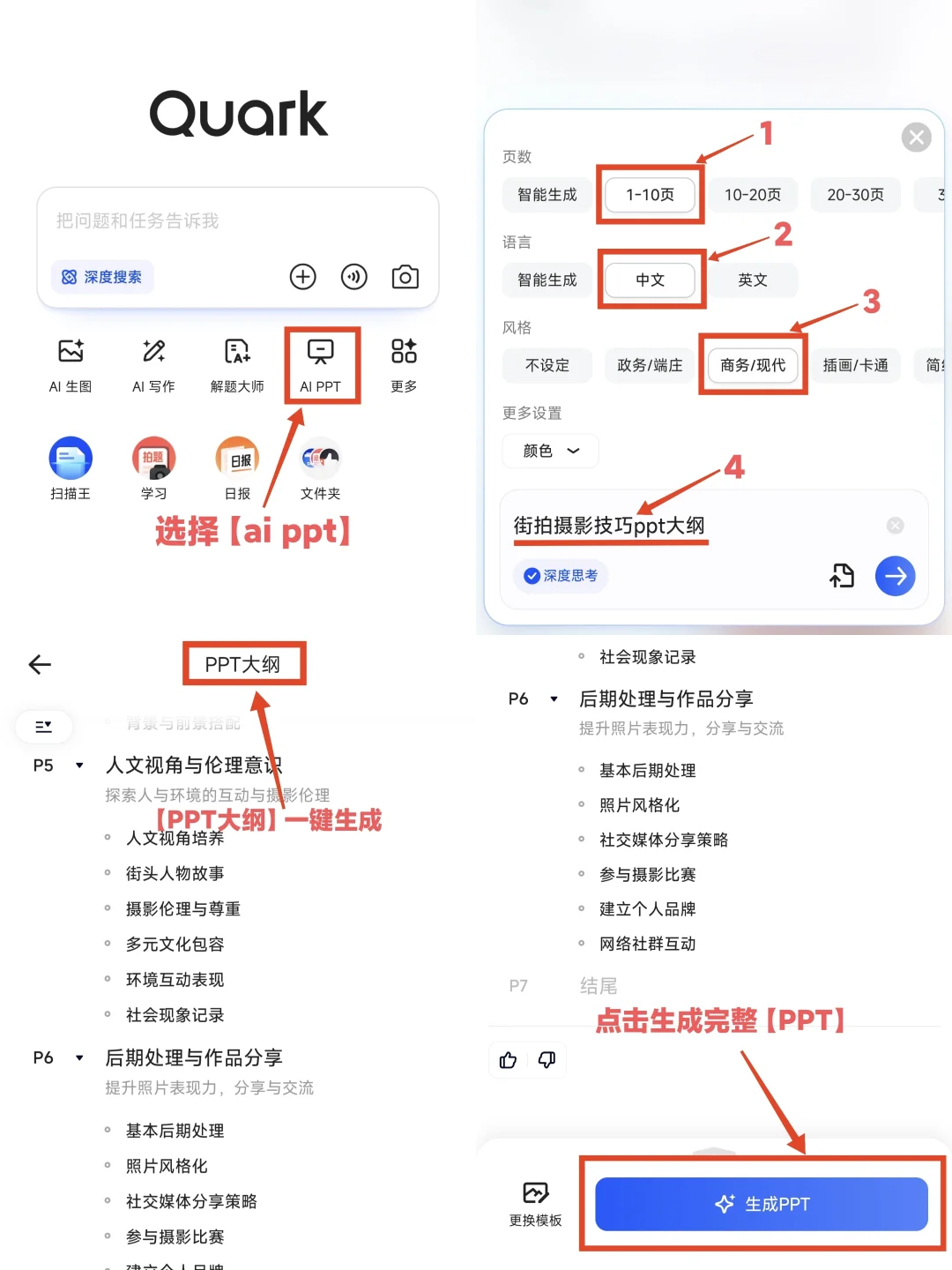 ✅操作:打开夸克,选择【ai ppt】→【选择页数,语言,风格】→输入【街拍摄影技巧PPT教学大纲】自动排版+配文案!→生成PPT