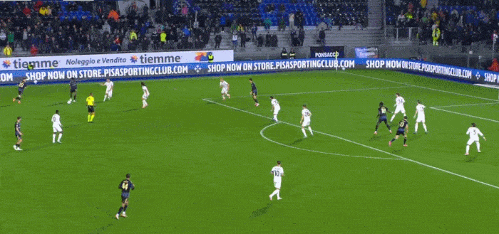 比赛第24分钟,比萨中场伊德里萨-图雷令人震惊地面对队友的高质量传中抢点将球踢偏,错失良机,这也是两队本场创造出的最好的一次机会:
