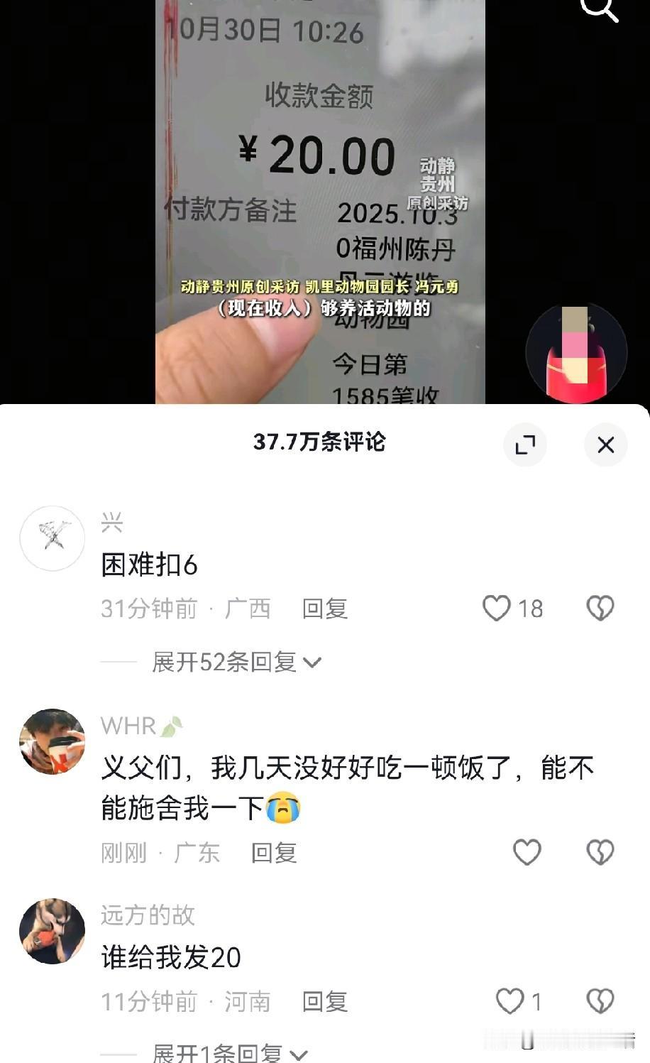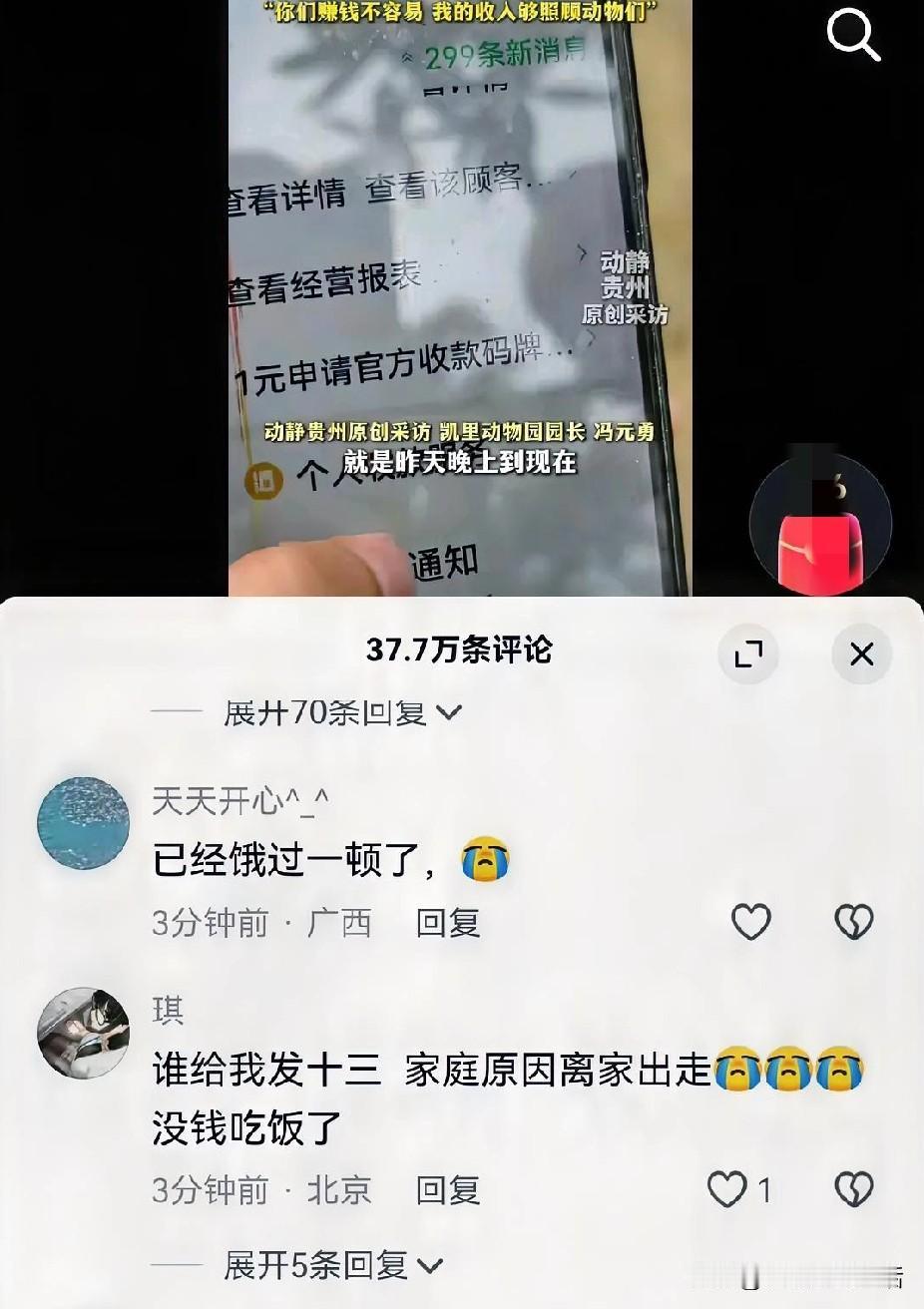 这一幕太恶心人了 凯里动物园收款码被放到了网上以后,手机就不停的在响,就连半夜都不消停。 就在全国网友欢心雀跃的为小动物们,以后能有很好的照顾的时候,竟然出现了很多的骗子,把自己的收款码伪装成了动物园园长的,利用大家的爱心进行行骗。 更是出现了无数的网络乞丐,说什么没钱吃饭了,已经饿了几顿了,没有工作了,离家出走的都好意思出来乞讨,真是不知道怎么想的。 最离谱的是,居然还有人跑出来乱认义父的,就为了骗那几十块钱。 当然这里面大多数都是开玩笑的,也不会有几个人认真,基本上都是一笑而过。 不过我们也无法分辨那个是真困难,那个是开玩笑的,但是有一点,穷人饭都吃不上了,应该不会跑到评论里留言吧,这个年代,只要不懒惰,吃饭还应该不是太难的事情吧? 最恶心的就是那些骗子,每次只骗你20,你追不回来,还没法找帽子叔叔。 园长爷爷已经劝过大家了,千万不要再上当受骗了。 凯里深山动物园