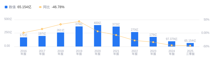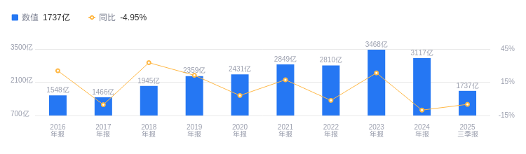 2025年三季度,保利发展营业收入达1737.22亿元,行业排名1/69,远超行业平均数117.27亿元和中位数19.38亿元,高于行业第二名万科A的1613.88亿元。主营业务中,房地产销售收入1051.43亿元,占比89.98%,其他业务收入114.17亿元,占比9.77%,其他(补充)收入2.97亿元,占比0.25%。当期净利润为65.15亿元,同样位居行业第一,远高于行业平均数-7.07亿元和中位数-936.87万元,高于第二名*ST中地的45.86亿元。