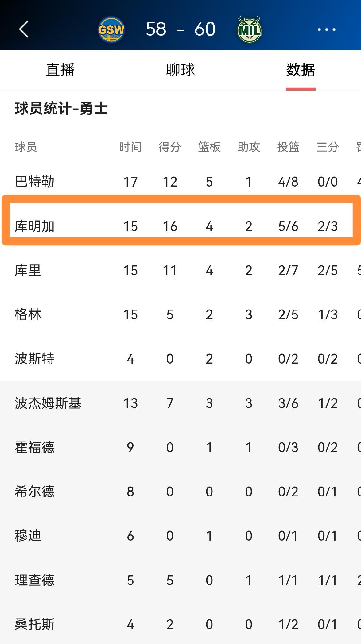 勇士大将库明加真是太让人欣喜若狂了!今天勇士在客场挑战雄鹿,目前双方半场战罢,勇士暂时以58:60落后于对手。值得注意的是,在上半场比赛中,库明加在攻防两端都打出了极为精彩的表现。 在上半场比赛中,库明加首发出战15分钟,投篮6中5,其中三分球3中2、罚球4中4极为高效的砍下16分4篮板2助攻1盖帽,他的场上正负值为+5。 从库明加在上半场比赛中的表现来看,他确实越来越适合勇士了,我觉得库明加应该不会离开勇士了。