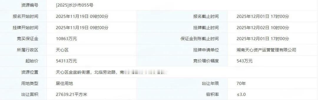 10月30日,长沙市自然资源和规划局挂牌天心区金盆岭街道锌厂地块(编号〔2025〕长沙市055号),这宗二环内的纯住宅用地将于12月2日正式出让,起拍总价5.4313亿元,起拍楼面价6550元/㎡,凭借核心区位与成熟配套,成为四季度长沙土拍市场的焦点。 该地块北临劳动路、南临天剑路,出让面积27639.21㎡(约41.47亩),规划为纯住宅用地,容积率≤3.0,建筑密度≤22%,绿地率≥35%,建筑限高100米。目前地块征拆工作已全部完成,属净地出让,为后续开发节省了时间成本。按照规划要求,项目将打造住宅新规产品,需落实阳台统一封闭设计,交付前完成施工,这与此前中国铁建·花语江南等新规项目的品质标准一脉相承。 作为天心区中心城区的稀缺宅地,其区位优势尤为突出。地块紧邻地铁1号线侯家塘站,步行约800米即可抵达,通过劳动西路、芙蓉中路等主干道可快速通达全城 。教育资源方面,直线距离仰天湖小学本部仅数百米,该学校作为天心区老牌名校,升学质量稳居区域前列,周边还分布着中雅培粹学校等优质教育资源。 生活配套上,地块毗邻贺龙体育馆,叮叮mall、凯德广场等商业体均在3公里生活圈内,湖南省儿童医院、长沙市第三医院等医疗资源也能快速抵达。值得注意的是,周边多为湖南省第六工程有限公司机关小区等老旧单位房,二手房均价约8903元/㎡ ,且近三年无新增住宅供应,新房竞品基本空白,未来项目入市后将填补区域改善需求缺口。 从价格来看,6550元/㎡的起拍楼面价在天心区处于合理区间。对比今年天心区其他地块,8月暮云街道042号地块楼面价仅2430元/㎡,7月航迹大道附近034号地块楼面价1885元/㎡,而芙蓉区定王台核心地块2月成交楼面价达9435元/㎡ 。锌厂地块的起拍价既反映了二环内核心区位的价值,又较芙蓉区等超核心板块存在一定价格优势,具备较强的市场吸引力。 地块竞买设置了多项常规性要求,包括落实装配式建筑、绿色建造标准,实现“交房即交证”,住宅毛坯销售均价接受政府价格监制等。值得关注的是,项目需按“精美街道”建设要求,承担建筑前区人行道功能及公共附属设施维护,这对开发商的协同设计能力提出了更高要求。 目前长沙核心区宅地供应持续收紧,天心区今年已出让的宅地多位于南城或城郊板块,二环内纯住宅用地极为稀缺。业内人士分析,该地块净地属性叠加成熟配套,预计将吸引保利、万科等深耕长沙的房企参与角逐,若溢价成交,未来毛坯售价或向1.3万-1.5万元/㎡区间靠拢,与周边能建天誉府等项目形成品质互补。