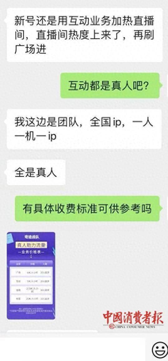 10月26日,《中国消费者报》记者联系到代刷公司“奇迹战队”的工作人员,对方表示新号适合用互动业务加热直播间,等直播间热度上来后,再刷“广场”(展示实时直播的聚合平台)热度,同时强调“我们是专业团队,实行一人一机一IP模式,IP覆盖全国,全是真人操作”。