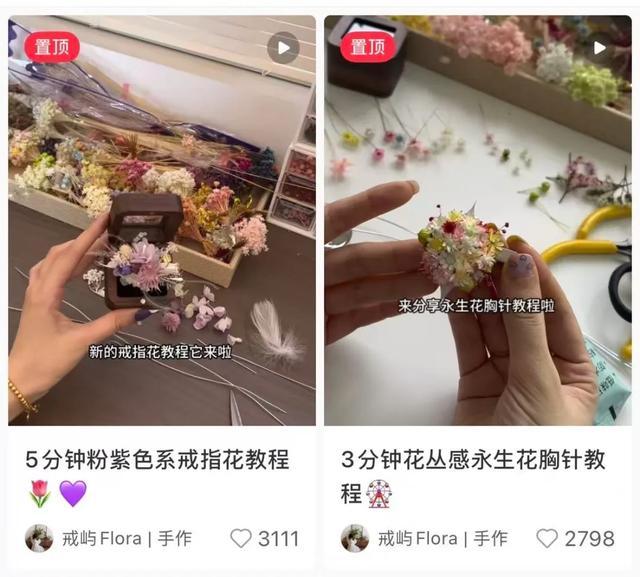 在社交平台上,一个名为“戒屿Flora|手作”的账号最近有点火,这个账号主打分享各种花艺戒指的制作视频,很受网友喜爱,短短几个月时间内就已经积累起了好几千粉丝,获得了2.6万赞。
