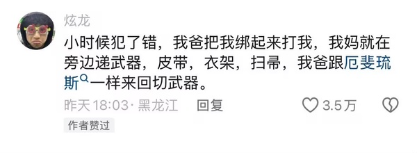 小时候犯了错,我爸把我绑起来打我,我妈就在旁边递武器,皮带,衣架,扫帚,我爸跟厄斐琉斯一样来回切武器。