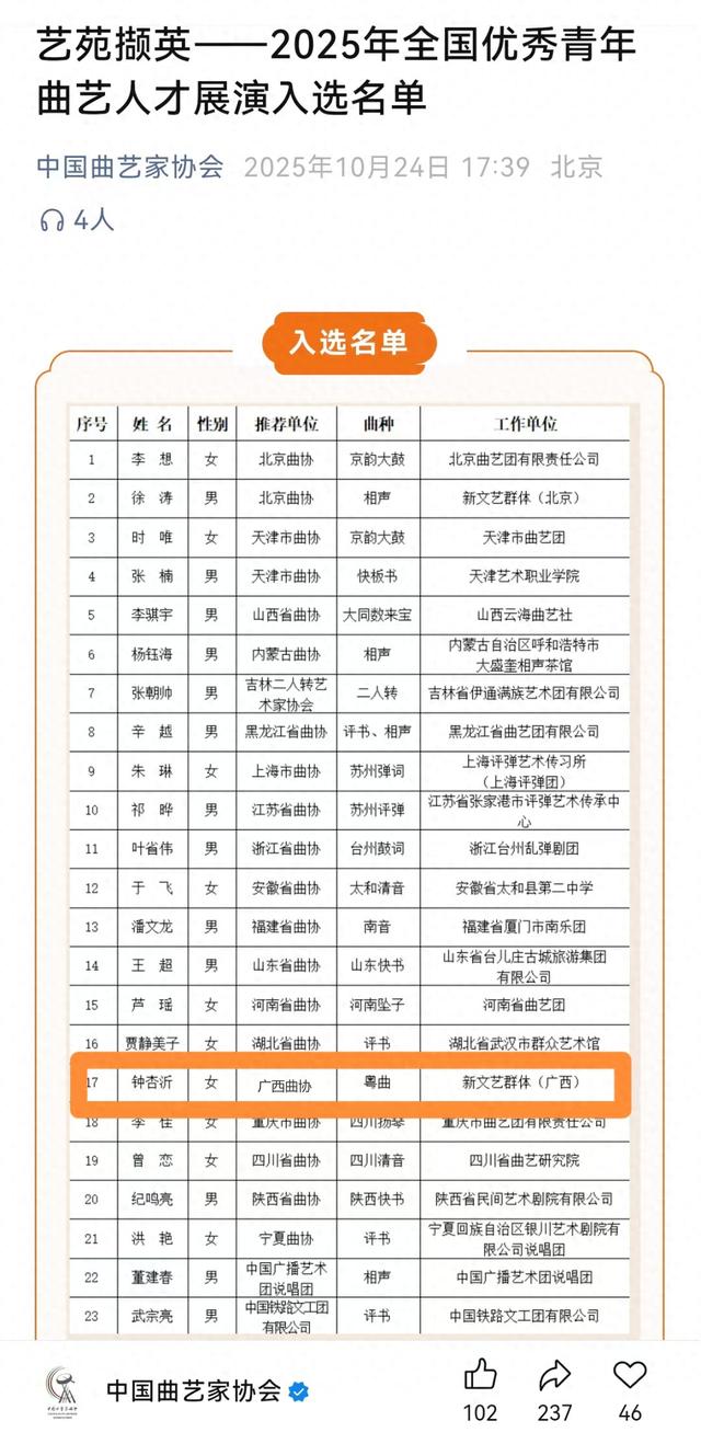 “艺苑撷英——2025年全国优秀青年曲艺人才展演”入选名单公布,梧州市青年曲艺演员钟杏沂入选。