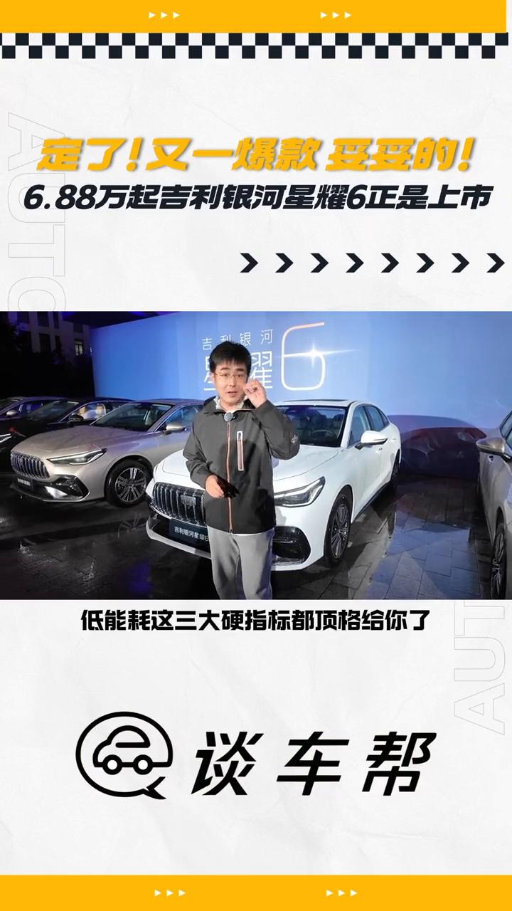 定了!又一爆款妥妥的!6.88万起,吉利银河星耀6正是上市。 谈车帮。 兄弟们,现在吉利真的是杀疯了!就在刚刚,吉利银河星耀6在杭州正式上市,价格和功能通通被卷到极致。作为一款"7万级"的电混轿车,它不仅拥有越级的尺寸,更把豪华感、智能化、低能耗这三大硬指标都顶格给你了。 ·首先4806mm的车身,2756mm的轴距,不管前排还是后排,坐进去就知道什么叫"大级别享受"。不到10万就能拥有20万级的空间感和气场。 ·再说动力组合,搭载了雷神AI电混2.0系统,1.5L插混系统电+油双模兼得。125km纯电续航,城市纯电通勤没有压力。1700km综合续航长途更是无忧。百公里2.8L的亏电油耗,也是同级别非常优秀的表现了。 ·智能座舱也给力,10.25寸液晶仪表,14.6寸中控大屏,还有Flyme Auto手机车机互联,看导航、刷视频、互动语音,操作就像用手机一样顺滑。 ·至于智驾辅助系统,星耀6也是同级的狠角色。它搭载了千里浩瀚H3高阶智驾系,3个毫米波雷达、11个摄像头,12个超声波雷达,配合128TOPS算力芯片,支持城市高速NOA,自动泊车、紧急避让等实用场景。 最后帮你算笔账,不到10万的价格,能把空间、智能、性能、安全一次性打包家轿你还能找到谁?预算有限但产品力绝对不将就,银河星耀6估计又将是银河家族的新爆款了。