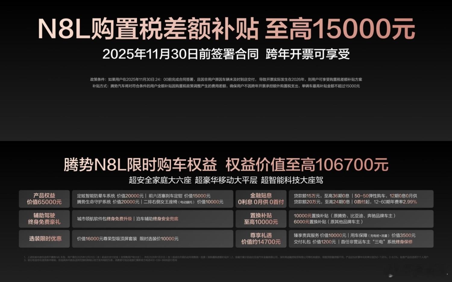10月28日上市发布的腾势N8L,2款车型,价格29.98-32.98万,越级价值终极满足!不仅空间、安全能打,智能化更是戳中家庭用户痛点!一台家人全票通过的车大六座SUV首选腾势N8L29.98万起
