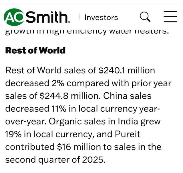 根据最新财报,2025年第二季度A.O.史密斯中国区收入为10.113亿美元,较2024年同期微降1%;净利润为1.522亿美元,同比下降3%。