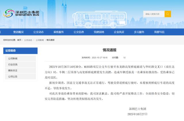 近日,有网友发视频称,深圳一辆双层公交车在途经桥下时,顶部被挤压变形遭“削顶”,有人员受伤。对此事故,深圳巴士集团发布情况通报,2025年10月26日14时30分,M193路双层公交车行驶至布龙路高架桥底辅道与华旺路交叉口(南往北方向)时,车辆二层顶部与高架桥桥底横梁发生刮蹭,造成车辆受损及一名乘客轻微刮伤,受伤乘客已及时送医。