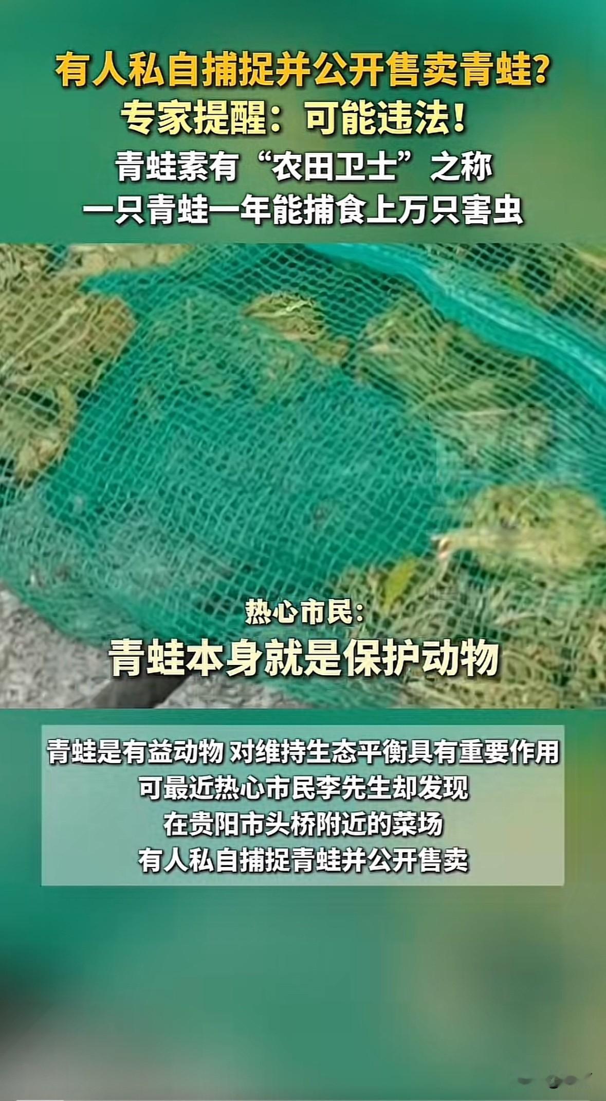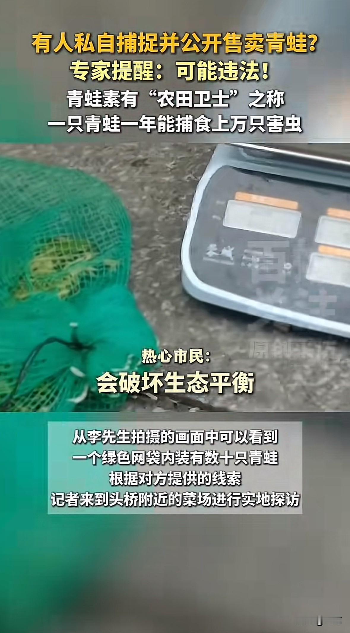 近期多地出现私自捕捉售卖青蛙的情况。贵阳有人在菜场兜售青蛙,湖南、河北、四川等地有人非法捕蛙售蛙被处罚,有人捕200多只野生青蛙获刑,还有人因捕国家二级保护动物虎纹蛙被罚。 野生青蛙多是“三有”保护动物,抓1只就违法,20只以上可能入刑。青蛙是农田卫士,一年能吃上万只害虫,捕售它们会破坏生态。而且野生青蛙体内有寄生虫,吃了容易生病,所谓治病偏方根本不靠谱。 不管是为了口腹之欲还是小钱,都别碰野生青蛙。商家得有合法手续才能卖养殖蛙,大家发现非法售蛙要举报,守住生态底线也保护自己。