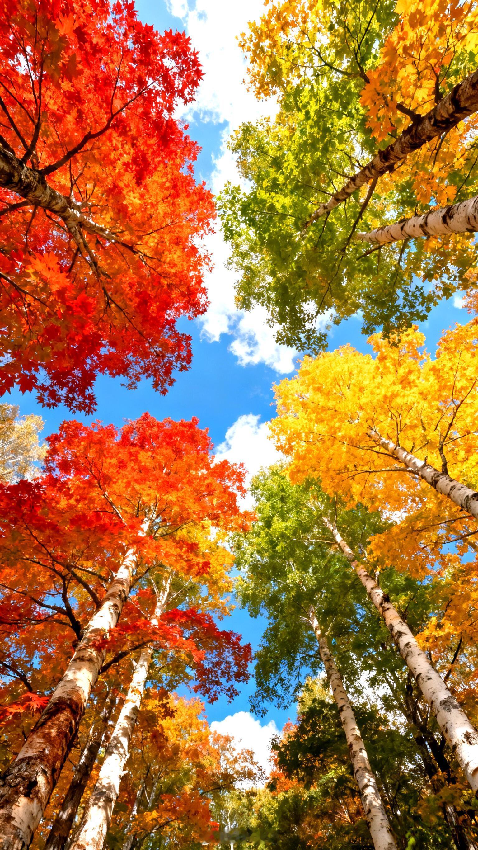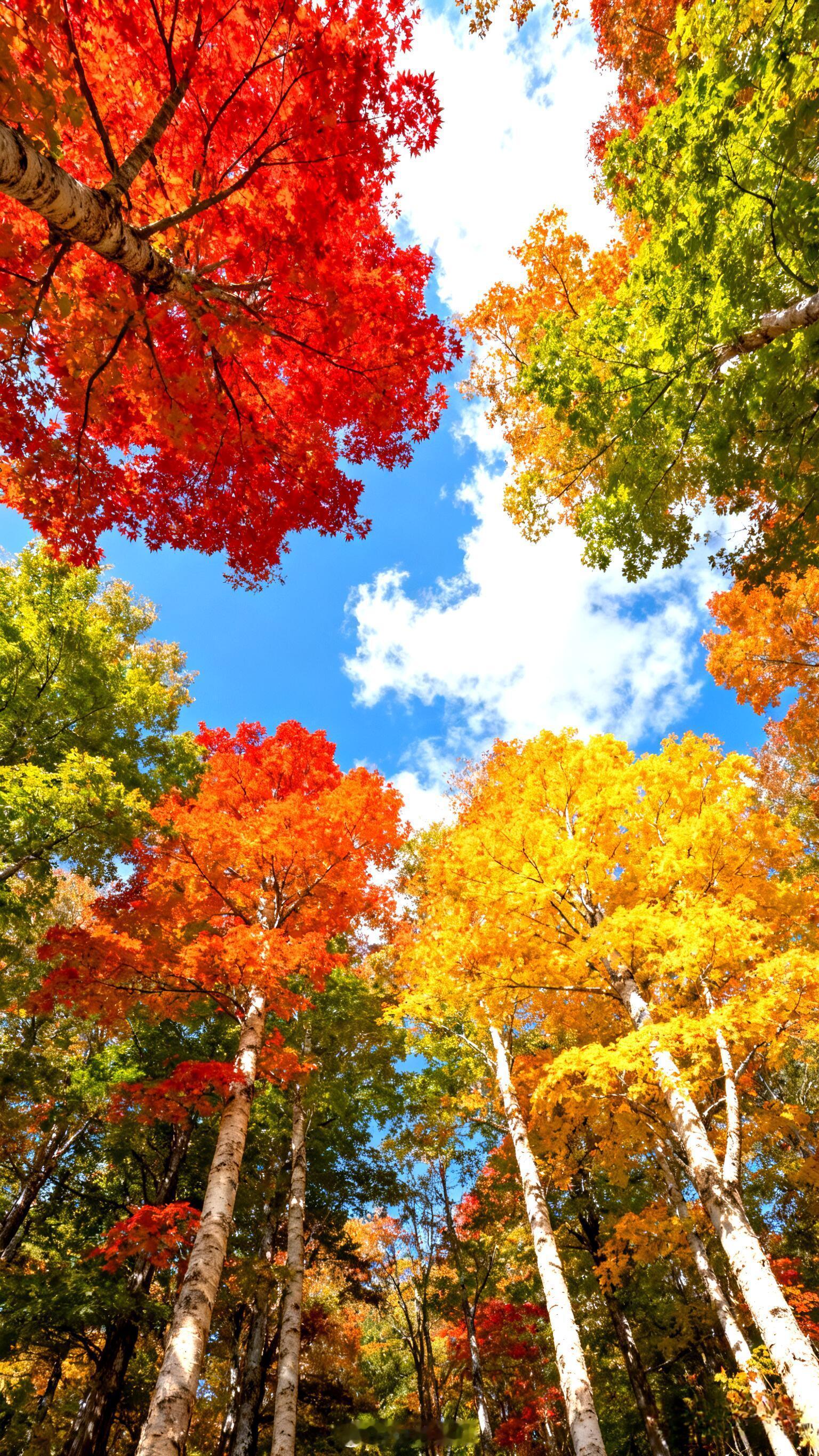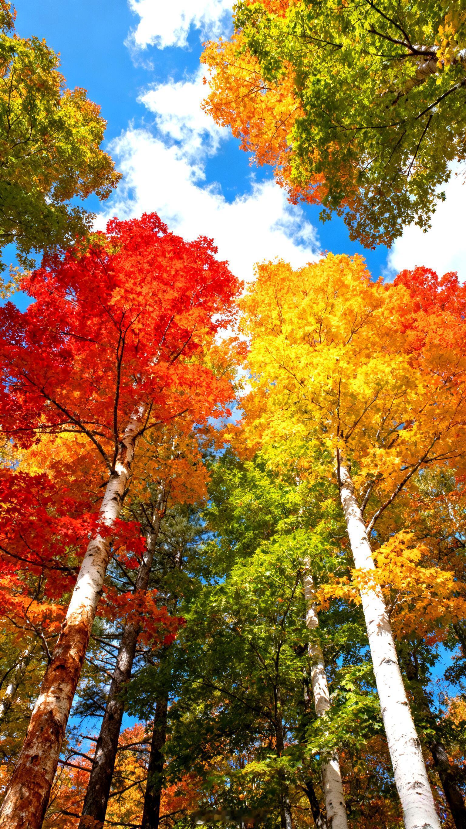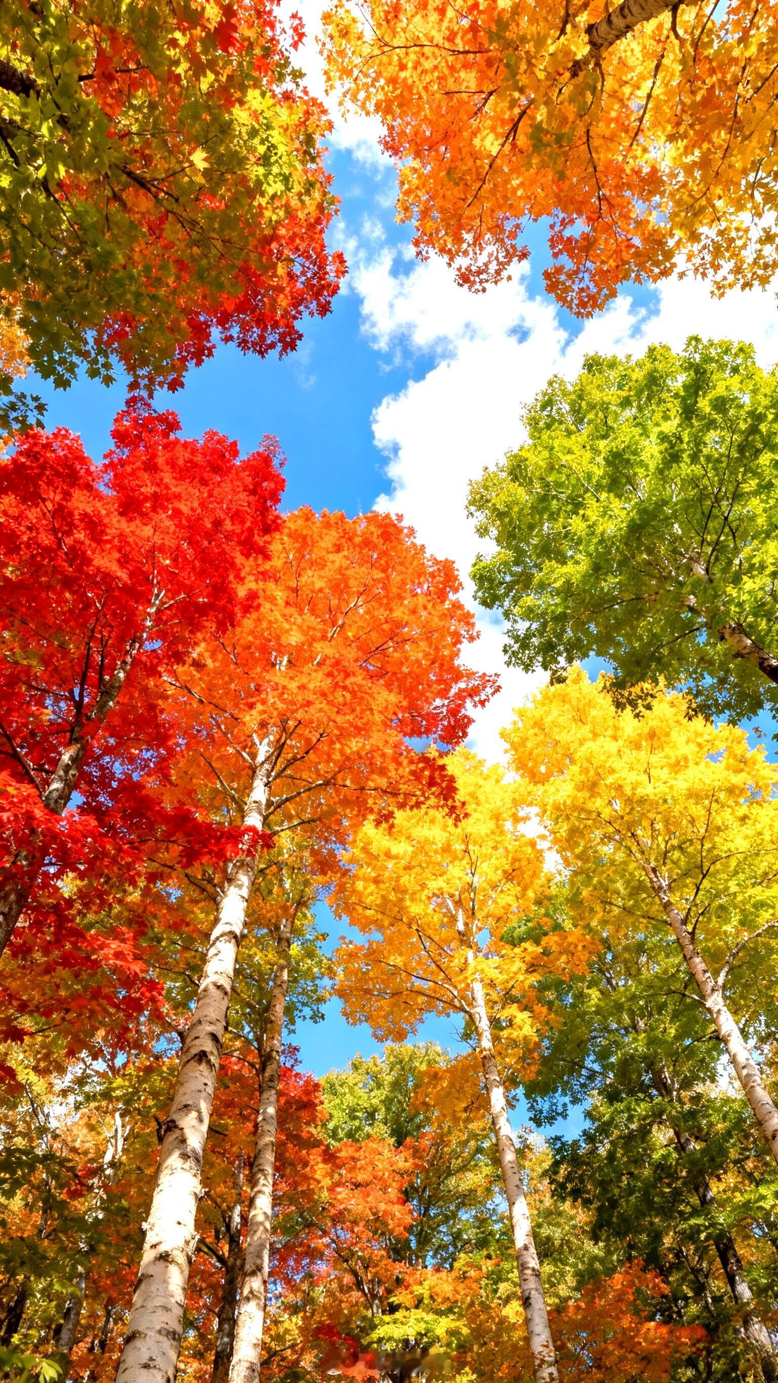 生活手记 在树林里一抬头,直接被这景色砸中了心巴红的像熟透的浆果、黄的像融化的芝士、还有没褪尽的夏绿,层层树叶把蓝天切成了棉花糖似的形状,阳光从缝隙里筛下来,暖得人心里发软~